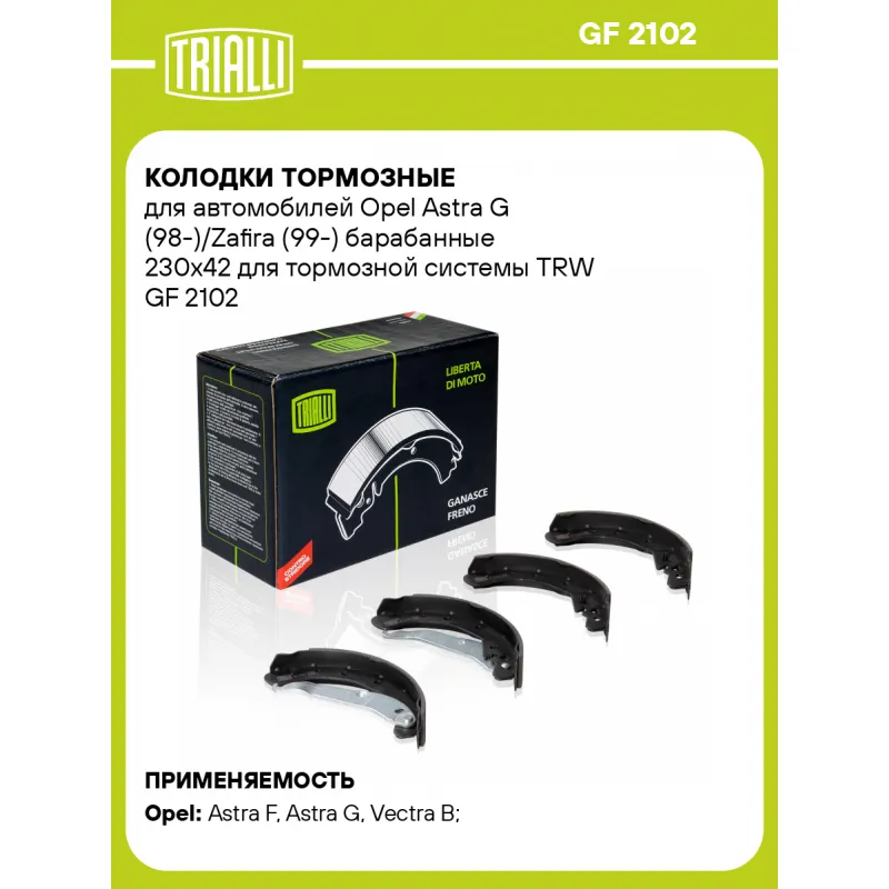 Колодки тормозные для автомобилей Opel Astra G (98-)/Zafira (99-) барабанные 230x42 для тормозной системы TRW Характеристики: Артикул: GF 2102 OEM номера: 93170618, 1605920, 1605064, 1605969, 93189978, 1605358, 1605062, 93171065, 90512792, 93284576, 93195331, 91158369, 1605224 Гарантийный срок: 1 год / 30 000 км Сторона установки: Задняя ось Количество на автомобиль: 1 Сопутствующие товары:: CF 0308 Ширина, мм: 42 Диаметр, мм: 230 Тормозная система: TRW Сопутствующий товар: Барабаны тормозные: TF 210201 Товарная линейка: BLACK Подходит для авто: Opel Astra F (91-), Astra G (98-), Vectra B (95-), Zafira A (99-), Astra G (98-), Astra H (04-), Vectra B (95-), Zafira A (99-) Для проверки применяемости отправьте VIN автомобиля через вкладку "Есть вопросы о товаре?" Комплектация: Колодка тормозная - 4 шт Гарантия: от 1 года.