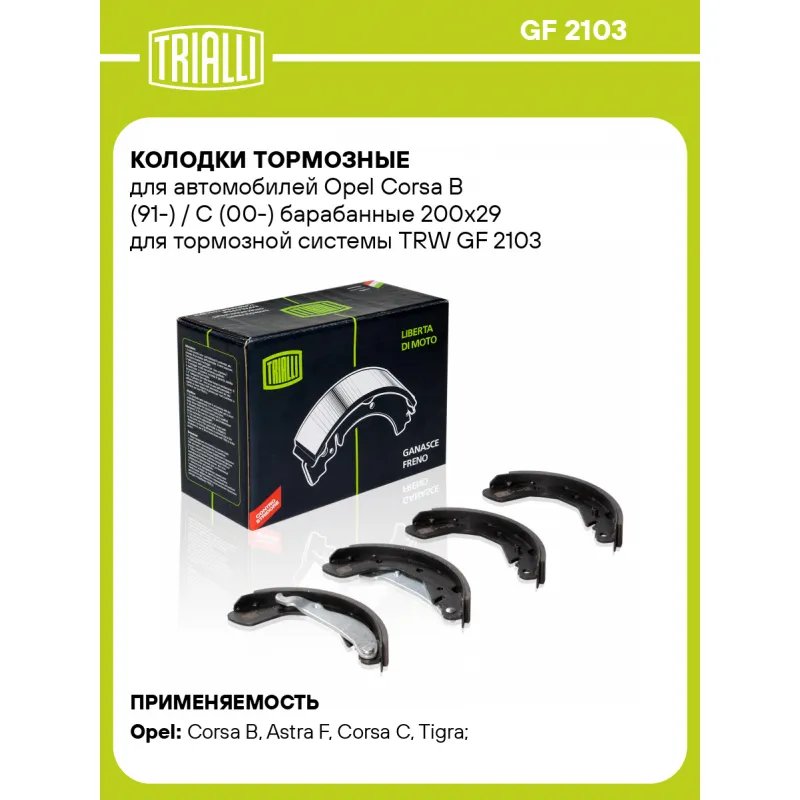 Колодки тормозные для автомобилей Opel Corsa B (91-) / C (00-) барабанные 200x29 для тормозной системы TRW Характеристики: Артикул: GF 2103 OEM номера: 1605041, 1605052, 1605811, 1605909, 91158363, 1605952, 90421796, 90542862, 91149504, 9196291, 93332948, 93287403 Гарантийный срок: 1 год / 30 000 км Сторона установки: Задняя ось Количество на автомобиль: 1 Ширина, мм: 29 Диаметр, мм: 200 Тормозная система: TRW Товарная линейка: BLACK Подходит для авто: Opel Corsa B (91-), Astra F (91-), Corsa C (00-), Tigra (94-) Для проверки применяемости отправьте VIN автомобиля через вкладку "Есть вопросы о товаре?" Комплектация: Колодка тормозная - 4 шт Гарантия: от 1 года.