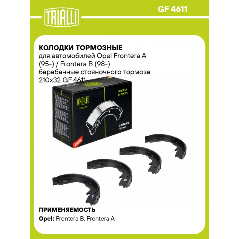 Колодки тормозные для автомобилей Opel Frontera A (95-) / Frontera B (98-) барабанные стояночного тормоза 210x32 Характеристики: Артикул: GF 4611 OEM номера: 1605859, 1605914, 90392944, 91149642 Гарантийный срок: 1 год / 30 000 км Сторона установки: Задняя ось Количество на автомобиль: 1 Ширина, мм: 32 Диаметр, мм: 210 Товарная линейка: BLACK Подходит для авто: Opel Frontera B (98-), Frontera A (91-) Для проверки применяемости отправьте VIN автомобиля через вкладку "Есть вопросы о товаре?" Комплектация: Колодка тормозная - 4 шт Гарантия: от 1 года.