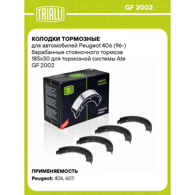 Колодки тормозные для автомобилей Peugeot 406 (96-) барабанные стояночного тормоза 185x30 для тормозной системы Ate Характеристики: Артикул: GF 2002 OEM номера: 4241J2, 4241J7, 4241K4, 4241K9 Гарантийный срок: 1 год / 30 000 км Сторона установки: Задняя ось Количество на автомобиль: 1 Ширина, мм: 30 Особенности конструкции:: Стояночная тормозная система Диаметр, мм: 185 Тормозная система: ATE Товарная линейка: BLACK Подходит для авто: Peugeot 406 (96-), 607 (02-), 607 (02-) Для проверки применяемости отправьте VIN автомобиля через вкладку "Есть вопросы о товаре?" Комплектация: Колодка тормозная - 4 шт Гарантия: от 1 года.