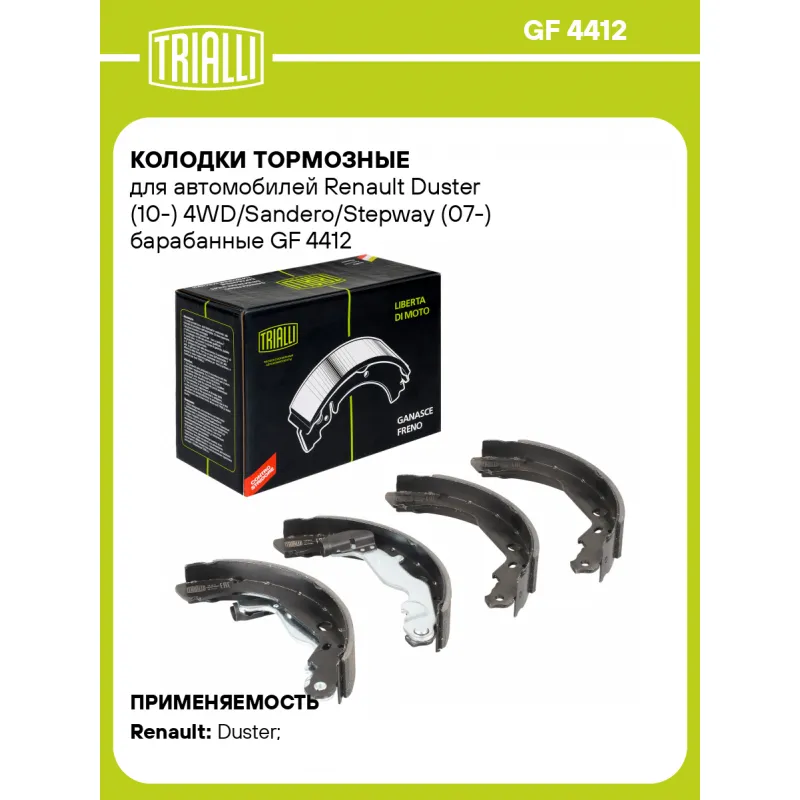Колодки тормозные для автомобилей Renault Duster (10-) 4WD/Sandero/Stepway (07-) барабанные Характеристики: Артикул: GF 4412 OEM номера: 4406000Q2F, 440607493R, 440605238R, 440607862R, 440A09374R Сторона установки: Задняя ось Количество на автомобиль: 1 Сопутствующие товары:: CF 0945, CF 0949 Ширина, мм: 42 Особенности конструкции:: С рычагом стояночного тормоза Диаметр, мм: 228 Гарантийный срок: 1 год / 30 000 км Сопутствующий товар: Барабаны тормозные: TF 015133, TF 015134 Товарная линейка: BLACK Сопутствующий товар: Шланги тормозные: BF 0974; BF 0975; BF 4636 Подходит для авто: Renault Duster (10-), Duster (10-) Для проверки применяемости отправьте VIN автомобиля через вкладку "Есть вопросы о товаре?" Комплектация: Колодка тормозная - 4 шт Гарантия: от 1 года.