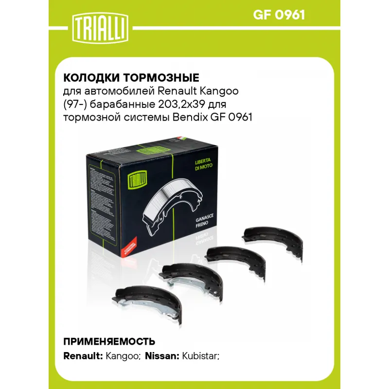 Колодки тормозные для автомобилей Renault Kangoo (97-) барабанные 203,2x39 для тормозной системы Bendix Характеристики: Артикул: GF 0961 OEM номера: 44060-00QAG, 77 01 205 523, 77 01 207 555, 44060033VA, 4406000Q3H, 770120755, 770120523, 8671020704 Гарантийный срок: 1 год / 30 000 км Сторона установки: Задняя ось Количество на автомобиль: 1 Сопутствующие товары:: CF 0127 Ширина, мм: 39 Диаметр, мм: 203,2 Тормозная система: Bendix Сопутствующий товар: Барабаны тормозные: TF 224026 Товарная линейка: BLACK Подходит для авто: Renault Kangoo (97-), Kangoo (97-) Nissan Kubistar (03-) Для проверки применяемости отправьте VIN автомобиля через вкладку "Есть вопросы о товаре?" Комплектация: Колодка тормозная - 4 шт Гарантия: от 1 года.