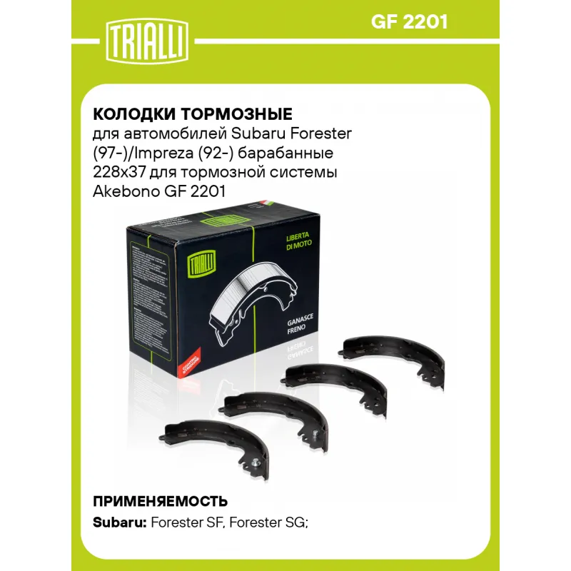 Колодки тормозные для автомобилей Subaru Forester (97-)/Impreza (92-) барабанные 228x37 для тормозной системы Akebono Характеристики: Артикул: GF 2201 OEM номера: 26257AA050, 26298AA010, 26257AA061, 26298AA011, 26257AA080, 26257AA070, 26257AA030, 26257AA081, 26298AA040, 26257AA040, 26257AA071 Гарантийный срок: 1 год / 30 000 км Сторона установки: Задняя ось Количество на автомобиль: 1 Сопутствующие товары:: CF 0118 Ширина, мм: 37 Диаметр, мм: 228 Тормозная система: Akebono Товарная линейка: BLACK Подходит для авто: Subaru Forester SF (97-), Forester SG (02-), Impreza G10 (92-), Impreza G11 (00-), Legacy B10 (89-), Legacy B11 (94-) Для проверки применяемости отправьте VIN автомобиля через вкладку "Есть вопросы о товаре?" Комплектация: Колодка тормозная - 4 шт Гарантия: от 1 года.