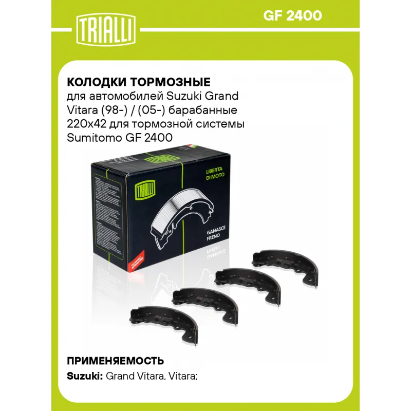Колодки тормозные для автомобилей Suzuki Grand Vitara (98-) / (05-) барабанные 220x42 для тормозной системы Sumitomo Характеристики: Артикул: GF 2400 OEM номера: 1A512638Z, 1A512638ZA, 5320065D00, 5320065D01, 5320065D10, 5320065D11, 5320067D00, 91177388, 91175617, 91175502, 91174796, 1A092638ZA, 5320065D12 Гарантийный срок: 1 год / 30 000 км Сторона установки: Задняя ось Количество на автомобиль: 1 Сопутствующие товары:: CF 0110 Ширина, мм: 42 Диаметр, мм: 220 Тормозная система: Sumitomo Товарная линейка: BLACK Подходит для авто: Suzuki Grand Vitara (98-), Grand Vitara (05-), Vitara (96-), Grand Vitara (05-) Для проверки применяемости отправьте VIN автомобиля через вкладку "Есть вопросы о товаре?" Комплектация: Колодка тормозная - 4 шт Гарантия: от 1 года.
