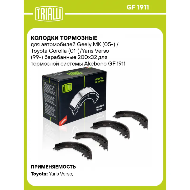 Колодки тормозные для автомобилей Geely MK (05-) / Toyota Corolla (01-)/Yaris Verso (99-) барабанные 200x32 для тормозной системы Akebono Характеристики: Артикул: GF 1911 OEM номера: 0449547010, 0449552100, 0449552040, 0449559020, 0449574020, 04495-0D060, 0449552020, 044950D070, 1014002679, 9000654, 449502080 Сторона установки: Задняя ось Количество на автомобиль: 1 Сопутствующие товары:: CF 194101, CF 194102 Ширина, мм: 32 Диаметр, мм: 200 Тормозная система: Akebono Гарантийный срок: 1 год / 30 000 км Товарная линейка: BLACK Подходит для авто: Toyota Yaris Verso (99-), Yaris Verso (99-) Для проверки применяемости отправьте VIN автомобиля через вкладку "Есть вопросы о товаре?" Комплектация: Колодка тормозная - 4 шт Гарантия: от 1 года.