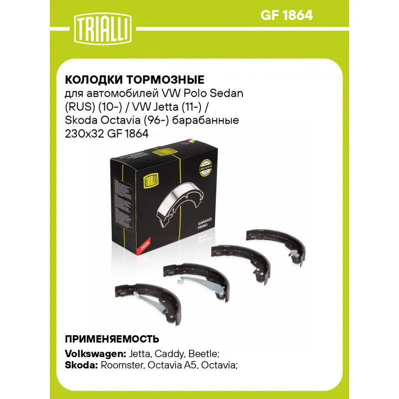 Колодки тормозные для автомобилей VW Polo Sedan (RUS) (10-) / VW Jetta (11-) / Skoda Octavia (96-) барабанные 230x32 Характеристики: Артикул: GF 1864 OEM номера: 1J0698525, 1J0609525, 1J0609526, 1J0609527, 1J0609528, 1J0698525B, 1J0698525A, 5C0698545, SHH3502051, SHH3502050, F33502004 Гарантийный срок: 1 год / 30 000 км Сторона установки: Задняя ось Количество на автомобиль: 1 Сопутствующие товары:: CF 2001 CF 2002 Ширина, мм: 32 Диаметр, мм: 230 Тормозная система: Ate Сопутствующий товар: Барабаны тормозные: TF 180102, TF 1802s Товарная линейка: BLACK Подходит для авто: Volkswagen Jetta (11-), Caddy (96-), Beetle (10-) Skoda Roomster (06-), Octavia A5 (04-), Roomster (06-), Octavia (96-), Octavia A5 (04-) Для проверки применяемости отправьте VIN автомобиля через вкладку "Есть вопросы о товаре?" Комплектация: Колодка тормозная - 4 шт Гарантия: от 1 года.