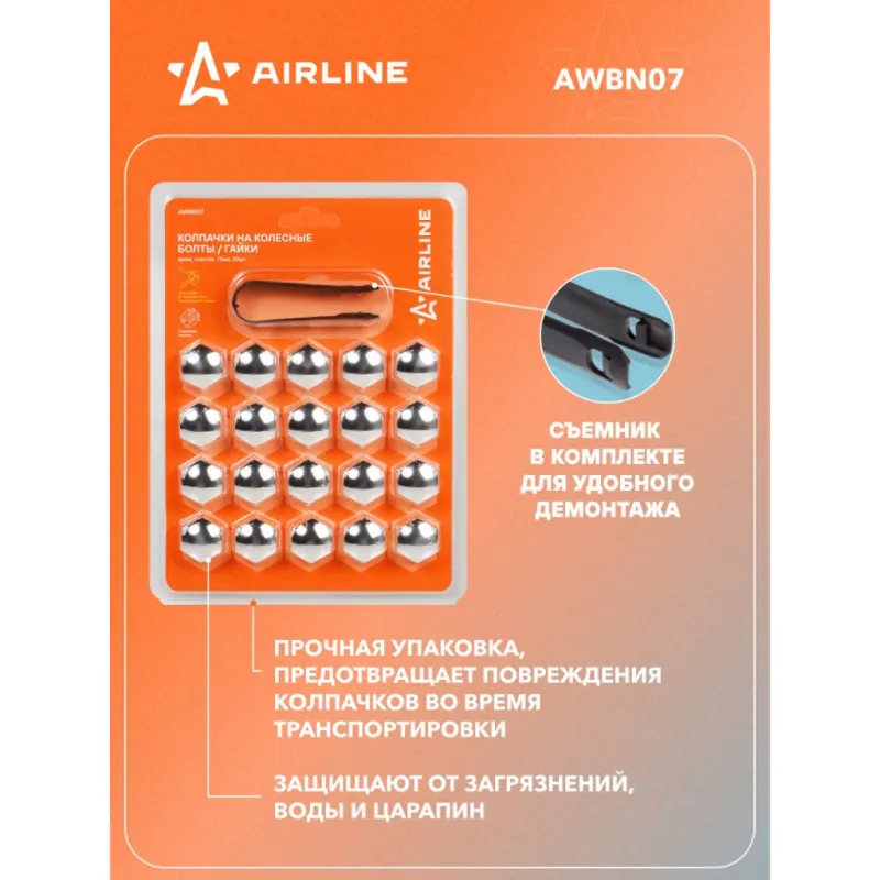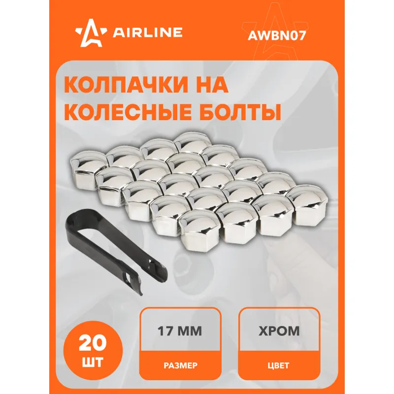 Колпачки на колесные болты/гайки 17 мм, хром, пластик, 20 шт.+ съёмник Описание: Колпачки на колесные болты или гайки AIRLINE AWBN07, которые упакованы в наборы по 20 шт. со специальным съемником для облегчения демонтажа. Изготовлены из ударопрочного пластика. Цвет: хром. В линейке AIRLINE вы найдете три типа размера колпачков на колесные болты - 17,19,21 мм. Размер колпачков AIRLINE AWBN07 - 17 мм. Колпачки устанавливаются сверху колесных болтов/гаек и служат для защиты колесного крепежа от внешнего воздействия агрессивной среды, сокрытия дефектов, а также являются отличным дополнением к внешнему тюнингу автомобиля. Преимущества: - Ударопрочный материал; - Зажим для съема в комплекте; - Стильный дизайн; - Защита колесного крепежа; - Прочная упаковка, предотвращает повреждения колпачков во время транспортировки. Колпачки на колесные болты служат не только для защиты, но и помогут украсить вашу машину, поэтому станет приятным подарком мужу, папе, бату, дяде, жене, маме, сестре, тете, коллеге. Этот аксессуар для машины - это универсальный подарок на любой праздник. В линейке AIRLINE, вы найдете широкий ассортимент высококачественных автотоваров и средств по уходу за вашим автомобилем, колпачки на шинный вентиль, колпачки на колесные болты гайки, съемник для колпачков, аксессуары для велосипедов, все для тюнинга, колпаки на автомобиль, светящиеся колпачки на колеса, аксессуары для мотоциклов, колясок. Мы гарантируем качество и надежность наших товаров. Характеристики: Артикул: AWBN07 Цвет: хром Размер гайки, мм: 17 Комплектация: Колпачки - 20 шт Съемник - 1 шт Блистер - 1 шт Гарантия: от 1 года.