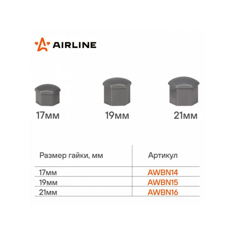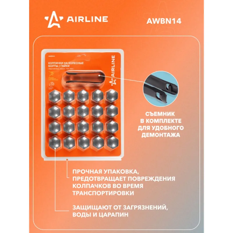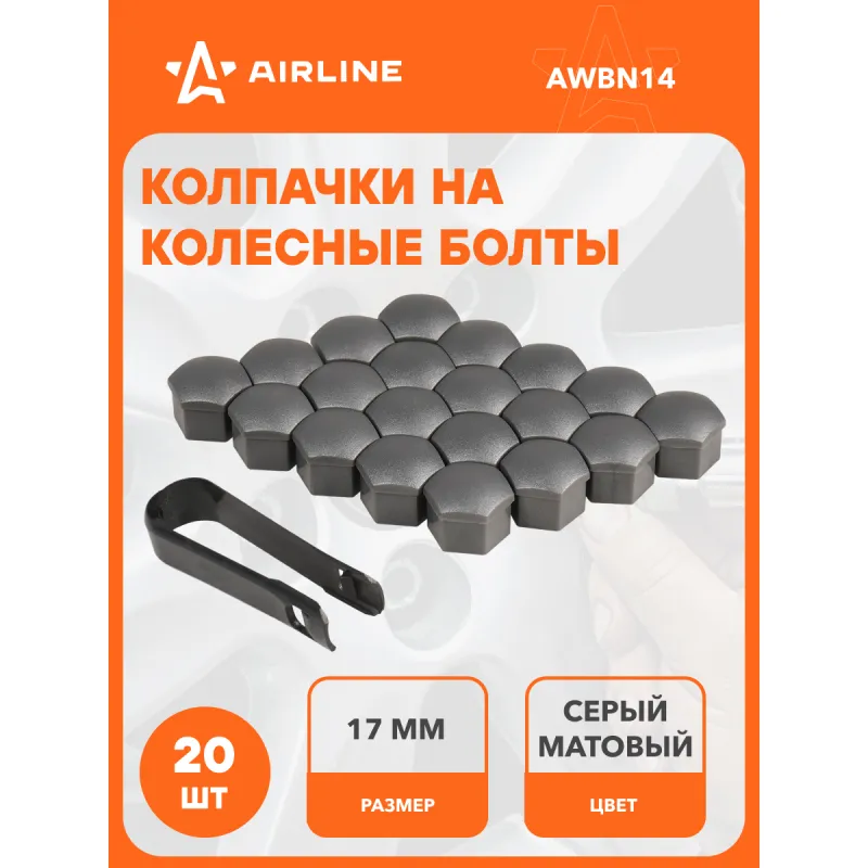 Колпачки на колесные болты/гайки 17 мм, серые матовые, пластик, 20 шт.+ съёмник Описание: Колпачки на колесные болты или гайки AIRLINE AWBN14, которые упакованы в наборы по 20 шт. со специальным съемником для облегчения демонтажа. Изготовлены из ударопрочного пластика. Цвет: серый матовый. В линейке AIRLINE вы найдете три типа размера колпачков на колесные болты - 17,19,21 мм. Размер колпачков AIRLINE AWBN14 - 17 мм. Колпачки устанавливаются сверху колесных болтов/гаек и служат для защиты колесного крепежа от внешнего воздействия агрессивной среды, сокрытия дефектов, а также являются отличным дополнением к внешнему тюнингу автомобиля. Преимущества: - Ударопрочный материал; - Зажим для съема в комплекте; - Стильный дизайн; - Защита колесного крепежа; - Прочная упаковка, предотвращает повреждения колпачков во время транспортировки. Колпачки на колесные болты служат не только для защиты, но и помогут украсить вашу машину, поэтому станет приятным подарком мужу, папе, бату, дяде, жене, маме, сестре, тете, коллеге. Этот аксессуар для машины - это универсальный подарок на любой праздник. В линейке AIRLINE, вы найдете широкий ассортимент высококачественных автотоваров и средств по уходу за вашим автомобилем, колпачки на шинный вентиль, колпачки на колесные болты гайки, съемник для колпачков, аксессуары для велосипедов, все для тюнинга, колпаки на автомобиль, светящиеся колпачки на колеса, аксессуары для мотоциклов, колясок. Мы гарантируем качество и надежность наших товаров. Характеристики: Артикул: AWBN14 Цвет: серый матовый Размер гайки, мм: 17 Комплектация: Колпачки - 20 шт Съемник - 1 шт Блистер - 1 шт Гарантия: от 1 года.