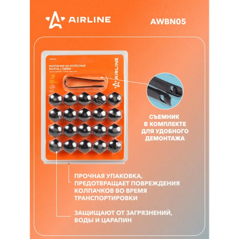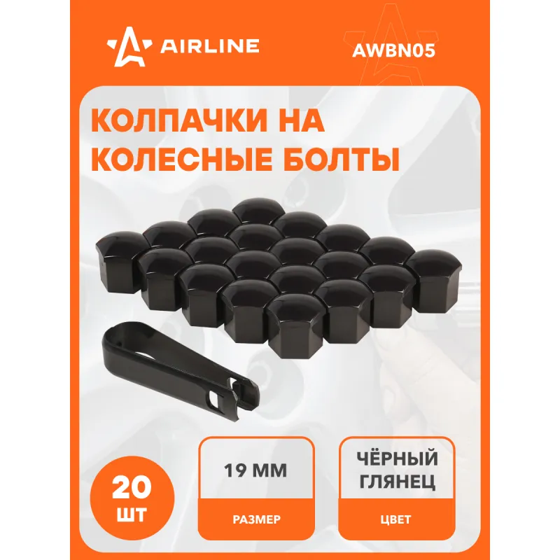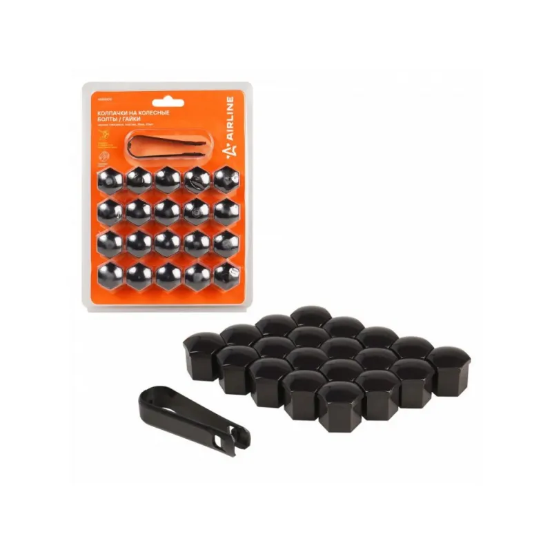 Колпачки на колесные болты/гайки 19 мм, черные глянцевые, пластик, 20 шт.+ съёмник Описание: Колпачки на колесные болты или гайки AIRLINE AWBN05, которые упакованы в наборы по 20 шт. со специальным съемником для облегчения демонтажа. Изготовлены из ударопрочного пластика. Цвет: черный глянцевый. В линейке AIRLINE вы найдете три типа размера колпачков на колесные болты - 17,19,21 мм. Размер колпачков AIRLINE AWBN05 - 19 мм. Колпачки устанавливаются сверху колесных болтов/гаек и служат для защиты колесного крепежа от внешнего воздействия агрессивной среды, сокрытия дефектов, а также являются отличным дополнением к внешнему тюнингу автомобиля. Преимущества: - Ударопрочный материал; - Зажим для съема в комплекте; - Стильный дизайн; - Защита колесного крепежа; - Прочная упаковка, предотвращает повреждения колпачков во время транспортировки. Колпачки на колесные болты служат не только для защиты, но и помогут украсить вашу машину, поэтому станет приятным подарком мужу, папе, бату, дяде, жене, маме, сестре, тете, коллеге. Этот аксессуар для машины - это универсальный подарок на любой праздник. В линейке AIRLINE, вы найдете широкий ассортимент высококачественных автотоваров и средств по уходу за вашим автомобилем, колпачки на шинный вентиль, колпачки на колесные болты гайки, съемник для колпачков, аксессуары для велосипедов, все для тюнинга, колпаки на автомобиль, светящиеся колпачки на колеса, аксессуары для мотоциклов, колясок. Мы гарантируем качество и надежность наших товаров. Характеристики: Артикул: AWBN05 Цвет: черный глянцевый Размер гайки, мм: 19 Комплектация: Колпачки - 20 шт Съемник - 1 шт Блистер - 1 шт Гарантия: от 1 года.