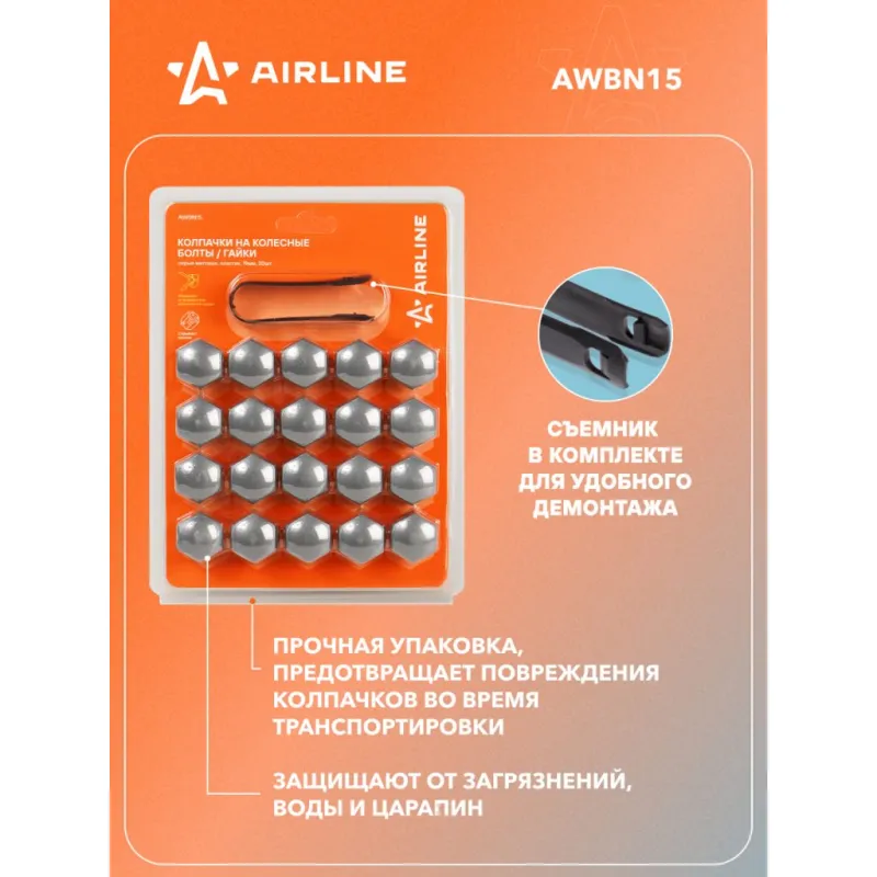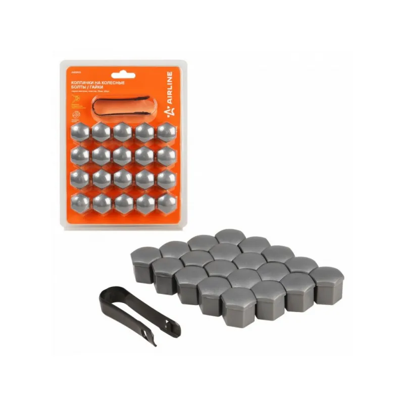 Колпачки на колесные болты/гайки 19 мм, серые матовые, пластик, 20 шт.+ съёмник Описание: Колпачки на колесные болты или гайки AIRLINE AWBN15, которые упакованы в наборы по 20 шт. со специальным съемником для облегчения демонтажа. Изготовлены из ударопрочного пластика. Цвет: серый матовый. В линейке AIRLINE вы найдете три типа размера колпачков на колесные болты - 17,19,21 мм. Размер колпачков AIRLINE AWBN15 - 19 мм. Колпачки устанавливаются сверху колесных болтов/гаек и служат для защиты колесного крепежа от внешнего воздействия агрессивной среды, сокрытия дефектов, а также являются отличным дополнением к внешнему тюнингу автомобиля. Преимущества: - Ударопрочный материал; - Зажим для съема в комплекте; - Стильный дизайн; - Защита колесного крепежа; - Прочная упаковка, предотвращает повреждения колпачков во время транспортировки. Колпачки на колесные болты служат не только для защиты, но и помогут украсить вашу машину, поэтому станет приятным подарком мужу, папе, бату, дяде, жене, маме, сестре, тете, коллеге. Этот аксессуар для машины - это универсальный подарок на любой праздник. В линейке AIRLINE, вы найдете широкий ассортимент высококачественных автотоваров и средств по уходу за вашим автомобилем, колпачки на шинный вентиль, колпачки на колесные болты гайки, съемник для колпачков, аксессуары для велосипедов, все для тюнинга, колпаки на автомобиль, светящиеся колпачки на колеса, аксессуары для мотоциклов, колясок. Мы гарантируем качество и надежность наших товаров. Характеристики: Артикул: AWBN15 Цвет: серый матовый Размер гайки, мм: 19 Комплектация: Колпачки - 20 шт Съемник - 1 шт Блистер - 1 шт Гарантия: от 1 года.