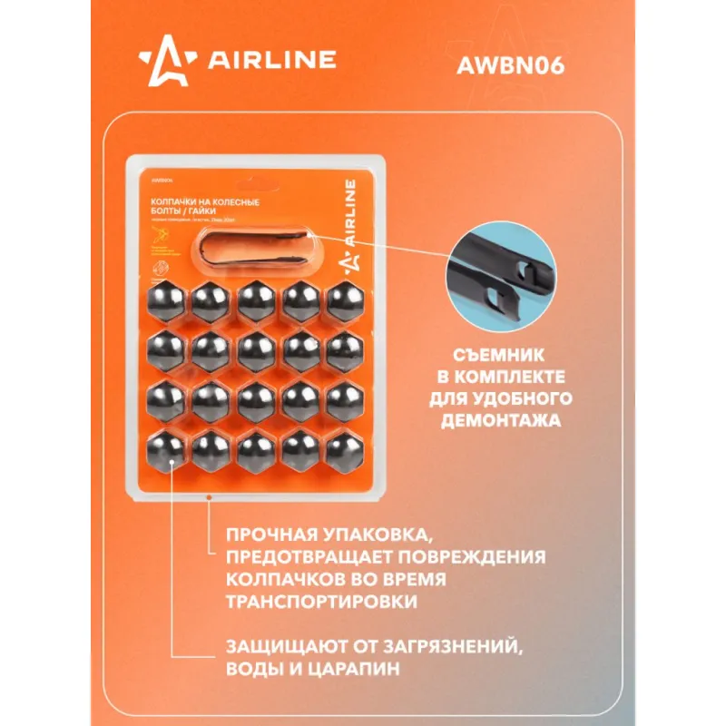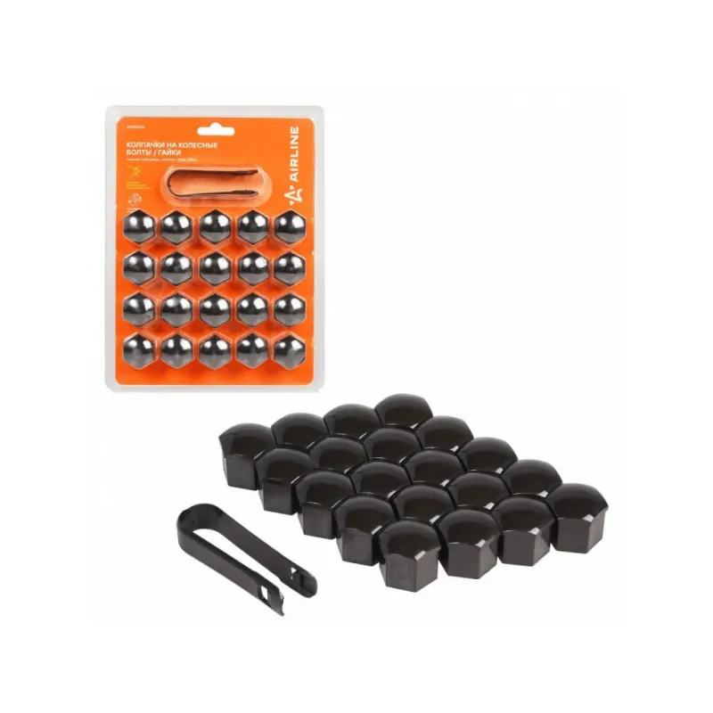 Колпачки на колесные болты/гайки 21 мм, черные глянцевые, пластик, 20 шт.+ съёмник Описание: Колпачки на колесные болты или гайки AIRLINE AWBN06, которые упакованы в наборы по 20 шт. со специальным съемником для облегчения демонтажа. Изготовлены из ударопрочного пластика. Цвет: черный глянцевый. В линейке AIRLINE вы найдете три типа размера колпачков на колесные болты - 17,19,21 мм. Размер колпачков AIRLINE AWBN06 - 21 мм. Колпачки устанавливаются сверху колесных болтов/гаек и служат для защиты колесного крепежа от внешнего воздействия агрессивной среды, сокрытия дефектов, а также являются отличным дополнением к внешнему тюнингу автомобиля. Преимущества: - Ударопрочный материал; - Зажим для съема в комплекте; - Стильный дизайн; - Защита колесного крепежа; - Прочная упаковка, предотвращает повреждения колпачков во время транспортировки. Колпачки на колесные болты служат не только для защиты, но и помогут украсить вашу машину, поэтому станет приятным подарком мужу, папе, бату, дяде, жене, маме, сестре, тете, коллеге. Этот аксессуар для машины - это универсальный подарок на любой праздник. В линейке AIRLINE, вы найдете широкий ассортимент высококачественных автотоваров и средств по уходу за вашим автомобилем, колпачки на шинный вентиль, колпачки на колесные болты гайки, съемник для колпачков, аксессуары для велосипедов, все для тюнинга, колпаки на автомобиль, светящиеся колпачки на колеса, аксессуары для мотоциклов, колясок. Мы гарантируем качество и надежность наших товаров. Характеристики: Артикул: AWBN06 Цвет: черный глянцевый Размер гайки, мм: 21 Комплектация: Колпачки - 20 шт Съемник - 1 шт Блистер - 1 шт Гарантия: от 1 года.