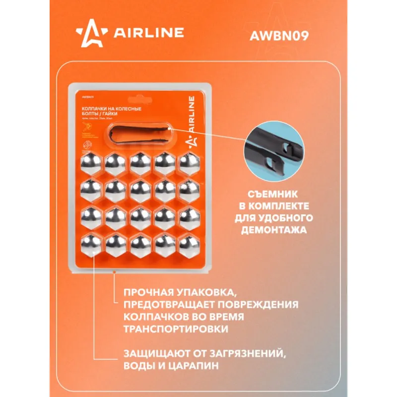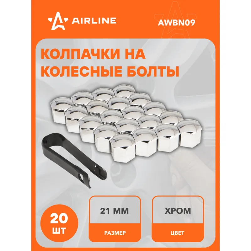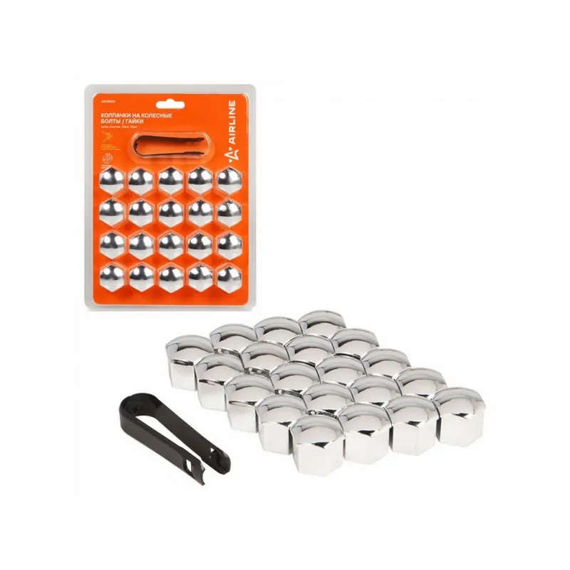 Колпачки на колесные болты/гайки 21 мм, хром, пластик, 20 шт.+ съёмник Описание: Колпачки на колесные болты или гайки AIRLINE AWBN09, которые упакованы в наборы по 20 шт. со специальным съемником для облегчения демонтажа. Изготовлены из ударопрочного пластика. Цвет: хром. В линейке AIRLINE вы найдете три типа размера колпачков на колесные болты - 17,19,21 мм. Размер колпачков AIRLINE AWBN09 - 21 мм. Колпачки устанавливаются сверху колесных болтов/гаек и служат для защиты колесного крепежа от внешнего воздействия агрессивной среды, сокрытия дефектов, а также являются отличным дополнением к внешнему тюнингу автомобиля. Преимущества: - Ударопрочный материал; - Зажим для съема в комплекте; - Стильный дизайн; - Защита колесного крепежа; - Прочная упаковка, предотвращает повреждения колпачков во время транспортировки. Колпачки на колесные болты служат не только для защиты, но и помогут украсить вашу машину, поэтому станет приятным подарком мужу, папе, бату, дяде, жене, маме, сестре, тете, коллеге. Этот аксессуар для машины - это универсальный подарок на любой праздник. В линейке AIRLINE, вы найдете широкий ассортимент высококачественных автотоваров и средств по уходу за вашим автомобилем, колпачки на шинный вентиль, колпачки на колесные болты гайки, съемник для колпачков, аксессуары для велосипедов, все для тюнинга, колпаки на автомобиль, светящиеся колпачки на колеса, аксессуары для мотоциклов, колясок. Мы гарантируем качество и надежность наших товаров. Характеристики: Артикул: AWBN09 Цвет: хром Размер гайки, мм: 21 Комплектация: Колпачки - 20 шт Съемник - 1 шт Блистер - 1 шт Гарантия: от 1 года.