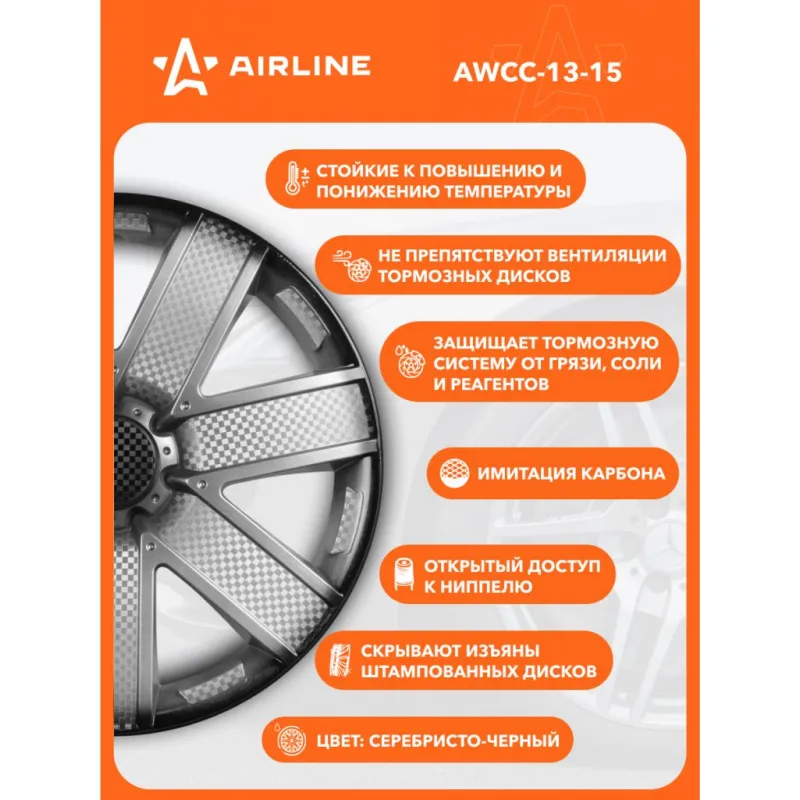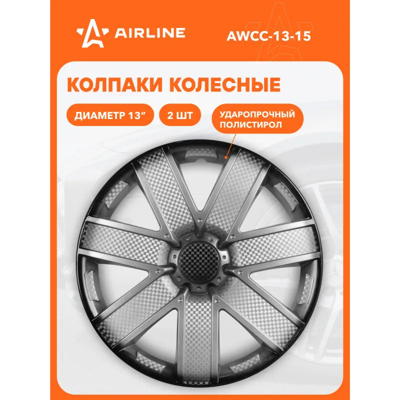 Колпаки колесные 13" "Гелакси +", серебристо-черный, карбон, компл. 2 шт. Описание: Колпаки колесные AIRLINE AWCC-13-15 изготовлены из ударопрочного полистирола, имеют модную текстуру имитирующую карбон и покрашены в популярные цвета. Снабжены надежными универсальными креплениями позволяющие обеспечивать равномерное распределение давления на все защелки. Колпаки AIRLINE защитят тормозную систему от грязи и скроют изъяны штампованных дисков, тем самым украсив ваш автомобиль. Особенности: * Количество зажимов - 10 шт.; * Совпадают к размерам диска автомобиля; * Обод жесткий, регулируемый согласно инструкции; * Стойкие к повышению и понижению температуры; * Не препятствуют вентиляции тормозных дисков; * Защищает тормозную систему от грязи, соли и реагентов; * Открытый доступ к ниппелю; * Скрывают изъяны штампованных дисков; * Цвет: серебристо-черный; * Инструкция по установке в комплекте; Колпаки на диски автомобильные помогут преобразить Ваш автомобиль, поэтому это отличное приобретение себе и в подарок автомобилисту, мужу, папе, бату, дяде, жене, маме, сестре, тете, коллеге. Характеристики: Артикул: AWCC-13-15 Диаметр, дюйм: 13 Цвет: серебристо-черный Вид крепления: защелки+ металл. обруч Тип крепления: защелки+ металл. обруч Комплектация: Колпак - 2 шт Крепление (кольцо) - 2 шт Инструкция - 1 шт Гарантия: от 1 года.