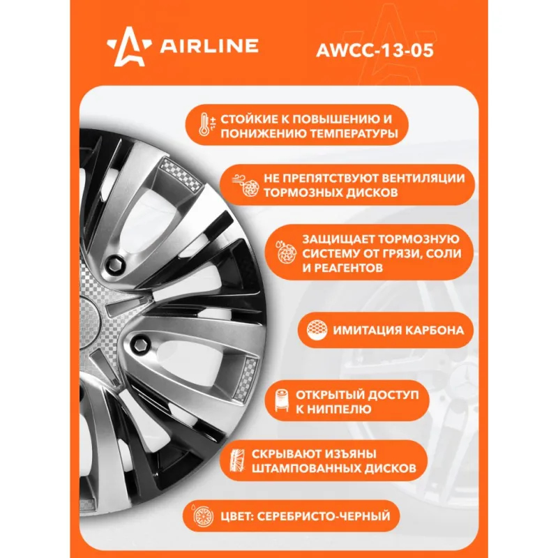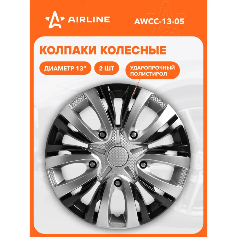 Колпаки колесные 13" "Лион Т ", серебристый/черный, карбон, компл. 2 шт. Описание: Колпаки колесные AIRLINE AWCC-13-05 изготовлены из ударопрочного полистирола, имеют модную текстуру имитирующую карбон и покрашены в популярные цвета. Снабжены надежными универсальными креплениями позволяющие обеспечивать равномерное распределение давления на все защелки. Колпаки AIRLINE защитят тормозную систему от грязи и скроют изъяны штампованных дисков, тем самым украсив ваш автомобиль. Особенности: * Количество зажимов - 10 шт.; * Совпадают к размерам диска автомобиля; * Обод жесткий, регулируемый согласно инструкции; * Стойкие к повышению и понижению температуры; * Не препятствуют вентиляции тормозных дисков; * Защищает тормозную систему от грязи, соли и реагентов; * Открытый доступ к ниппелю; * Скрывают изъяны штампованных дисков; * Цвет: серебристый, черный; * Инструкция по установке в комплекте; Колпаки на диски автомобильные помогут преобразить Ваш автомобиль, поэтому это отличное приобретение себе и в подарок автомобилисту, мужу, папе, бату, дяде, жене, маме, сестре, тете, коллеге. В линейке AIRLINE, вы найдете широкий ассортимент высококачественных автотоваров и средств по уходу за вашим автомобилем, аксессуары для авто в салон. Мы гарантируем качество и надежность наших товаров. Характеристики: Артикул: AWCC-13-05 Диаметр, дюйм: 13 Цвет: серебристый, черный Вид крепления: защелки+ металл. обруч Тип крепления: защелки+ металл. обруч Комплектация: Колпаки - 2 шт Крепление (кольцо) - 2 шт Инструкция - 1 шт Гарантия: от 1 года.