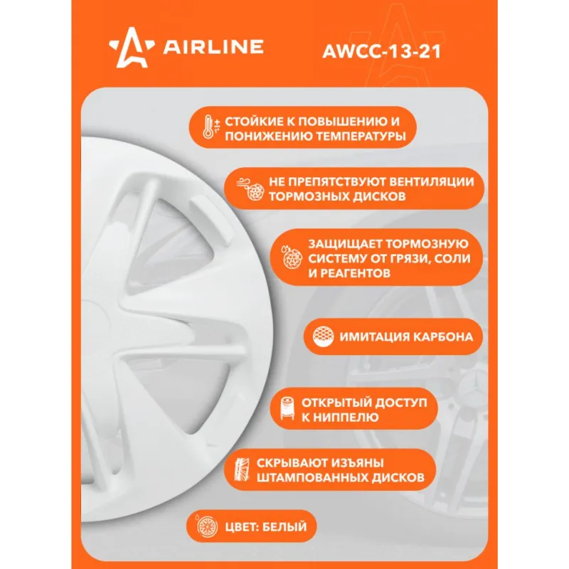 Колпаки колесные 13" "Супер Астра", белый, карбон, компл. 2 шт. Описание: Колпаки колесные AIRLINE AWCC-13-21 изготовлены из ударопрочного полистирола, имеют модную текстуру имитирующую карбон и покрашены в популярные цвета. Снабжены надежными универсальными креплениями позволяющие обеспечивать равномерное распределение давления на все защелки. Колпаки AIRLINE защитят тормозную систему от грязи и скроют изъяны штампованных дисков, тем самым украсив ваш автомобиль. Особенности: * Количество зажимов - 10 шт.; * Совпадают к размерам диска автомобиля; * Обод жесткий, регулируемый согласно инструкции; * Стойкие к повышению и понижению температуры; * Не препятствуют вентиляции тормозных дисков; * Защищает тормозную систему от грязи, соли и реагентов; * Открытый доступ к ниппелю; * Скрывают изъяны штампованных дисков; * Цвет: белый; * Инструкция по установке в комплекте; Колпаки на диски автомобильные помогут преобразить Ваш автомобиль, поэтому это отличное приобретение себе и в подарок автомобилисту, мужу, папе, бату, дяде, жене, маме, сестре, тете, коллеге. Характеристики: Артикул: AWCC-13-21 Диаметр, дюйм: 13 Цвет: белый Вид крепления: защелки+ металл. обруч Тип крепления: защелки+ металл. обруч Комплектация: 1. Колпаки-2 шт. 2. Крепление( кольцо)-2 шт. 3. Инструкция-1 шт. Гарантия: от 1 года.