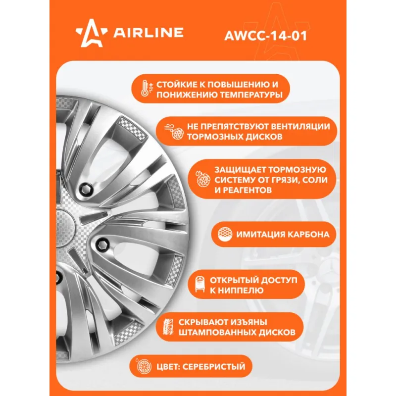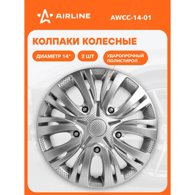 Колпаки колесные 14" "Лион", серебристый, карбон, компл. 2 шт. Описание: Колпаки колесные AIRLINE AWCC-14-01 изготовлены из ударопрочного полистирола, имеют модную текстуру имитирующую карбон и покрашены в популярные цвета. Снабжены надежными универсальными креплениями позволяющие обеспечивать равномерное распределение давления на все защелки. Колпаки AIRLINE защитят тормозную систему от грязи и скроют изъяны штампованных дисков, тем самым украсив ваш автомобиль. Особенности: * Количество зажимов - 10 шт.; * Совпадают к размерам диска автомобиля; * Обод жесткий, регулируемый согласно инструкции; * Стойкие к повышению и понижению температуры; * Не препятствуют вентиляции тормозных дисков; * Защищает тормозную систему от грязи, соли и реагентов; * Открытый доступ к ниппелю; * Скрывают изъяны штампованных дисков; * Цвет: серебристый; * Инструкция по установке в комплекте; Колпаки на диски автомобильные помогут преобразить Ваш автомобиль, поэтому это отличное приобретение себе и в подарок автомобилисту, мужу, папе, бату, дяде, жене, маме, сестре, тете, коллеге. В линейке AIRLINE, вы найдете широкий ассортимент высококачественных автотоваров и средств по уходу за вашим автомобилем, аксессуары для авто в салон. Мы гарантируем качество и надежность наших товаров. Характеристики: Артикул: AWCC-14-01 Диаметр, дюйм: 14 Цвет: серебристый Вид крепления: защелки+ металл. обруч Комплектация: Колпаки - 2 шт Крепление (кольцо) - 2 шт Инструкция - 1 шт Гарантия: от 1 года.
