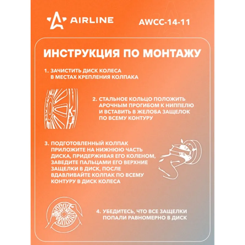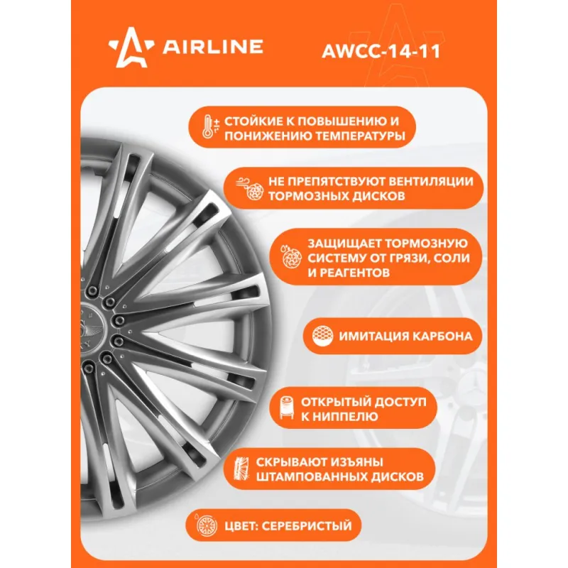 Колпаки колесные 14" "Скай", серебристый, компл. 2 шт. Описание: Колпаки колесные AIRLINE AWCC-14-11 изготовлены из ударопрочного полистирола, имеют модную текстуру имитирующую карбон и покрашены в популярные цвета. Снабжены надежными универсальными креплениями позволяющие обеспечивать равномерное распределение давления на все защелки. Колпаки AIRLINE защитят тормозную систему от грязи и скроют изъяны штампованных дисков, тем самым украсив ваш автомобиль. Особенности: * Количество зажимов - 10 шт.; * Совпадают к размерам диска автомобиля; * Обод жесткий, регулируемый согласно инструкции; * Стойкие к повышению и понижению температуры; * Не препятствуют вентиляции тормозных дисков; * Защищает тормозную систему от грязи, соли и реагентов; * Открытый доступ к ниппелю; * Скрывают изъяны штампованных дисков; * Цвет: серебристый; * Инструкция по установке в комплекте; Колпаки на диски автомобильные помогут преобразить Ваш автомобиль, поэтому это отличное приобретение себе и в подарок автомобилисту, мужу, папе, бату, дяде, жене, маме, сестре, тете, коллеге. Характеристики: Артикул: AWCC-14-11 Диаметр, дюйм: 14 Цвет: серебристый Вид крепления: защелки+ металл. обруч Комплектация: Колпаки - 2 шт Крепление (кольцо) - 2 шт Инструкция - 1 шт Гарантия: от 1 года.