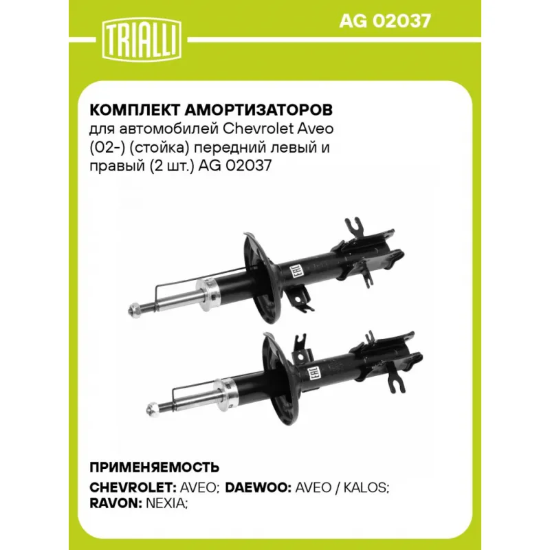 Комплект амортизаторов для автомобилей Chevrolet Aveo (02-) (стойка) передний левый и правый (2 шт.) Характеристики: Артикул: AG 02037 OEM номера: 96586887, 96653233, 96980826, 96408662, 96408663, 96408664, 96653232, 96653292, 96653294, 96980827, 96980824, 96586888, 96653234, 96410166, 96410168, 96586886, 96410165, 96410167, 96586885, 96653231, 96653291, 96653293 Товарная линейка: МП-серия Вид амортизатора: Масляный с газовым подпором низкого давления Тип верхнего крепления: Шток Тип нижнего крепления: Скоба Диаметр корпуса, мм: 45 Диаметр штока, мм: 20 Ход штока, мм: 162 Размер резьбы штока: M14x1.5 Тип амортизатора: Двухтрубный, гидравлический Ось (сторона установки): Спереди, слева Дополнительная информация: Упаковка изделия может отличаться от представленной на фото Присоединительная длина 2, мм: 510 Присоединительная длина 1, мм: 348 Гарантийный срок: 2 года/60 000 км Комплектация: Амортизатор (стойка) передний - 1 шт Гайка крепежная - 2 шт Амортизатор (стойка) передний - 1 шт Гарантия: от 1 года.