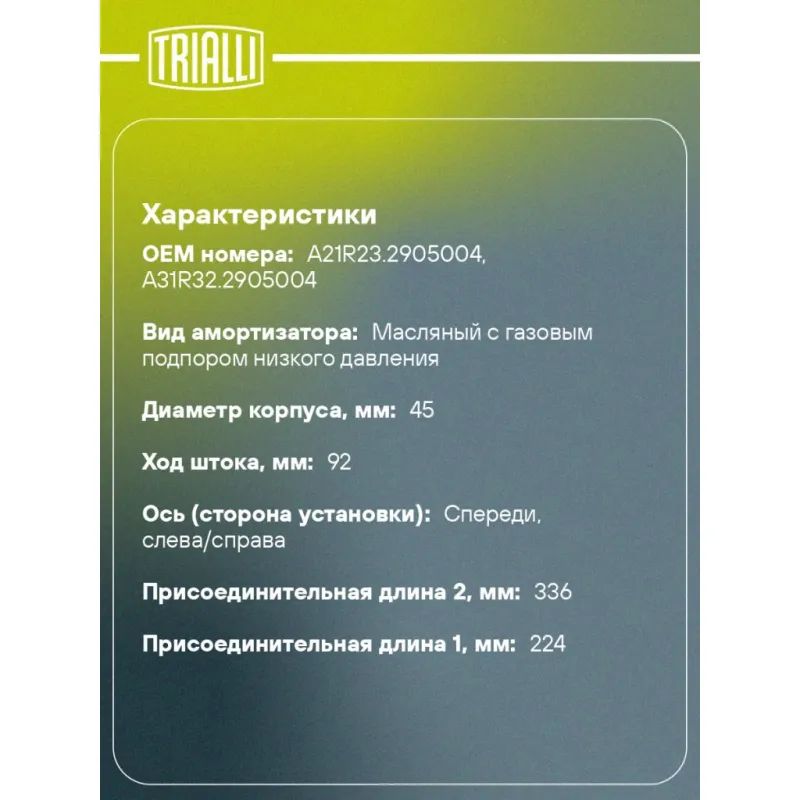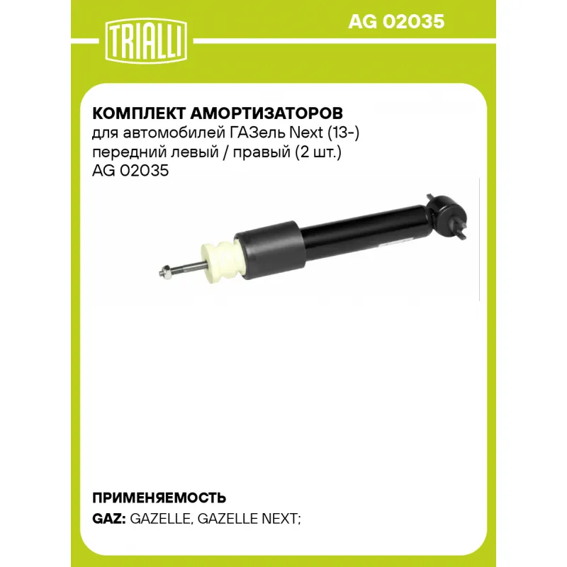 Комплект амортизаторов для автомобилей ГАЗель Next (13-) передний левый / правый (2 шт.) Характеристики: Артикул: AG 02035 OEM номера: A21R23.2905004, A31R32.2905004 Товарная линейка: МП-серия Вид амортизатора: Масляный с газовым подпором низкого давления Тип верхнего крепления: Шток Тип нижнего крепления: Проушина/сайлентблок-поперечина Диаметр корпуса, мм: 45 Диаметр штока, мм: 15 Ход штока, мм: 92 Размер резьбы штока: M10x1.25 Тип амортизатора: Двухтрубный, гидравлический Ось (сторона установки): Спереди, слева/справа Дополнительная информация: Упаковка изделия может отличаться от представленной на фото Присоединительная длина 2, мм: 336 Присоединительная длина 1, мм: 224 Гарантийный срок: 2 года/60 000 км Комплектация: Амортизатор передний - 2 шт Отбойник полиуретановый - 2 шт Кожух пылезащитный - 2 шт Гайка крепежная - 2 шт Шарнир резинометаллический - 2 шт Гарантия: от 1 года.