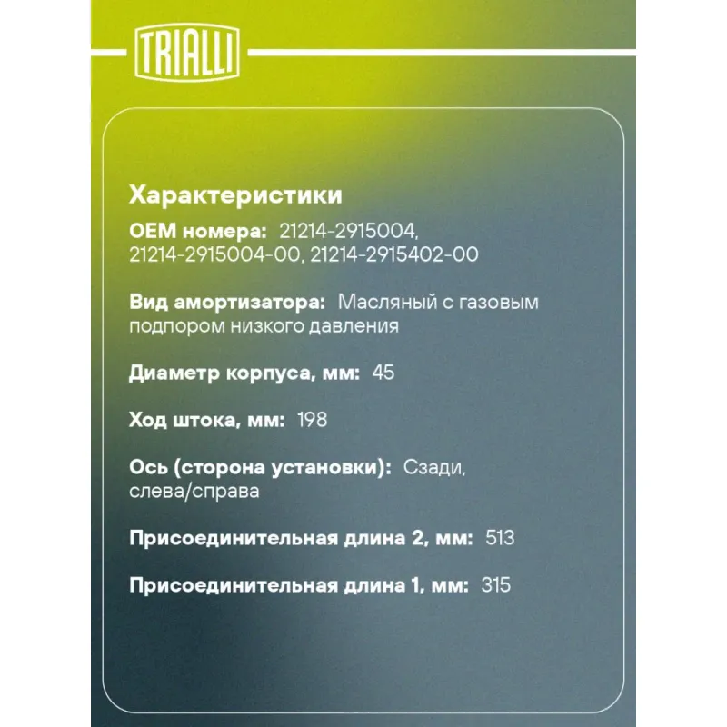 | Вид амортизатора | Масляный с газовым подпором низкого давления |