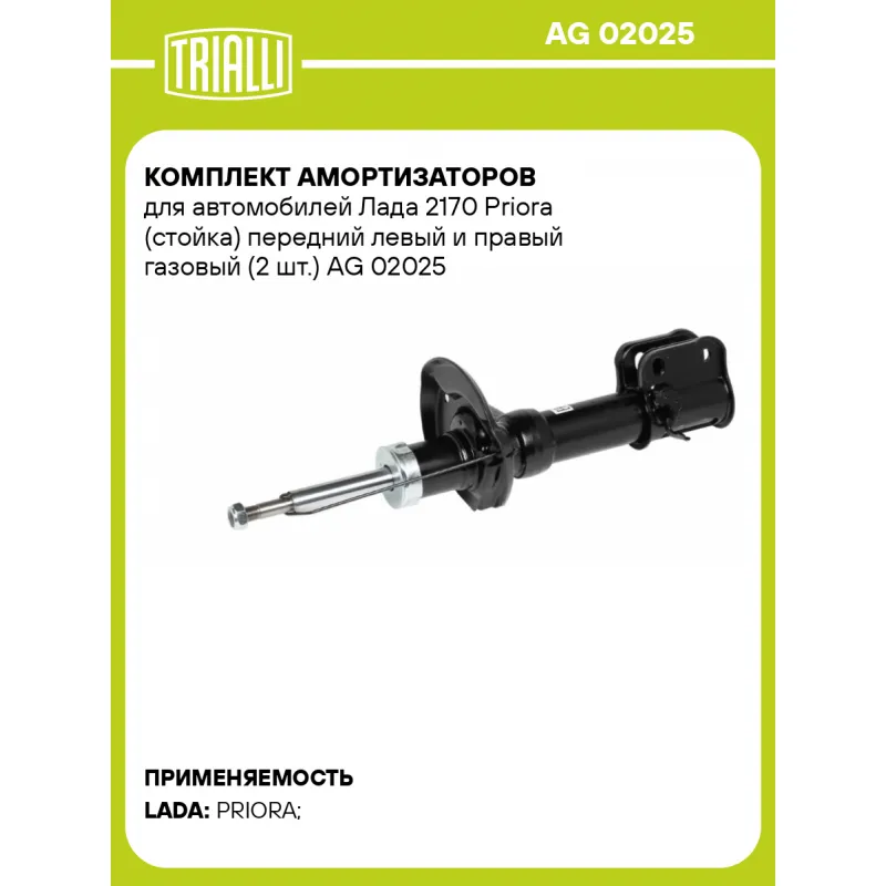 Комплект амортизаторов для автомобилей Лада 2170 Priora (стойка) передний левый и правый газовый (2 шт.) Характеристики: Артикул: AG 02025 OEM номера: 2170-2905003, 21700-2905003-00, 21700-2905403-00, 21700-2905403-03, 21700-2905403-50, 21700-2905403-82, 2170-2905002, 21700-2905002-00, 21700-2905402-00, 21700-2905402-03, 21700-2905402-50, 21700-2905402-82 Товарная линейка: МП-серия Вид амортизатора: Масляный с газовым подпором низкого давления Тип верхнего крепления: Шток Тип нижнего крепления: Скоба Диаметр корпуса, мм: 52 Диаметр штока, мм: 22 Ход штока, мм: 172 Размер резьбы штока: M14x1.5 Тип амортизатора: Двухтрубный, гидравлический Ось (сторона установки): Спереди, слева Дополнительная информация: Упаковка изделия может отличаться от представленной на фото Присоединительная длина 2, мм: 532 Присоединительная длина 1, мм: 360 Гарантийный срок: 2 года/60 000 км Комплектация: Амортизатор (стойка) передний - 1 шт Гайка крепежная - 2 шт Амортизатор (стойка) передний - 1 шт Гарантия: от 1 года.