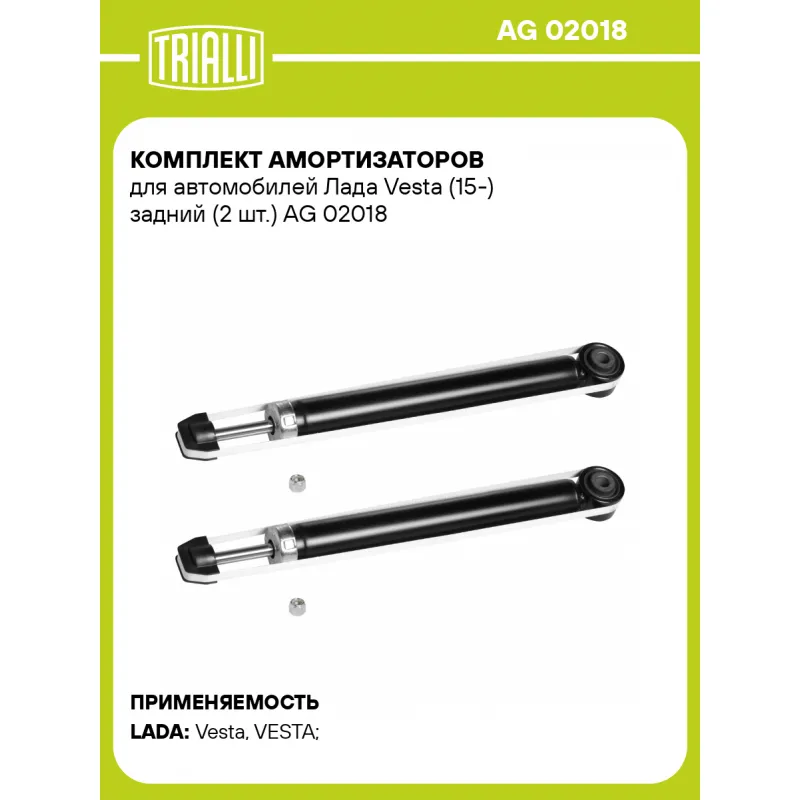 Комплект амортизаторов для автомобилей Лада Vesta (15-) задний (2 шт.) Характеристики: Артикул: AG 02018 OEM номера: 8450006786, 2180-2915402, 2180-2915402-00 Товарная линейка: МП-серия Вид амортизатора: Масляный с газовым подпором низкого давления Тип верхнего крепления: Шток Тип нижнего крепления: Проушина/сайлентблок Диаметр корпуса, мм: 47 Диаметр штока, мм: 12,5 Ход штока, мм: 237 Размер резьбы штока: M10x1.25 Тип амортизатора: Двухтрубный, гидравлический Ось (сторона установки): Сзади, слева/справа Дополнительная информация: Упаковка изделия может отличаться от представленной на фото Присоединительная длина 2, мм: 602 Присоединительная длина 1, мм: 375 Гарантийный срок: 2 года/60 000 км Комплектация: Амортизатор задний - 2 шт Шарнир резинометаллический - 2 шт Гайка крепежная - 2 шт Гарантия: от 1 года.