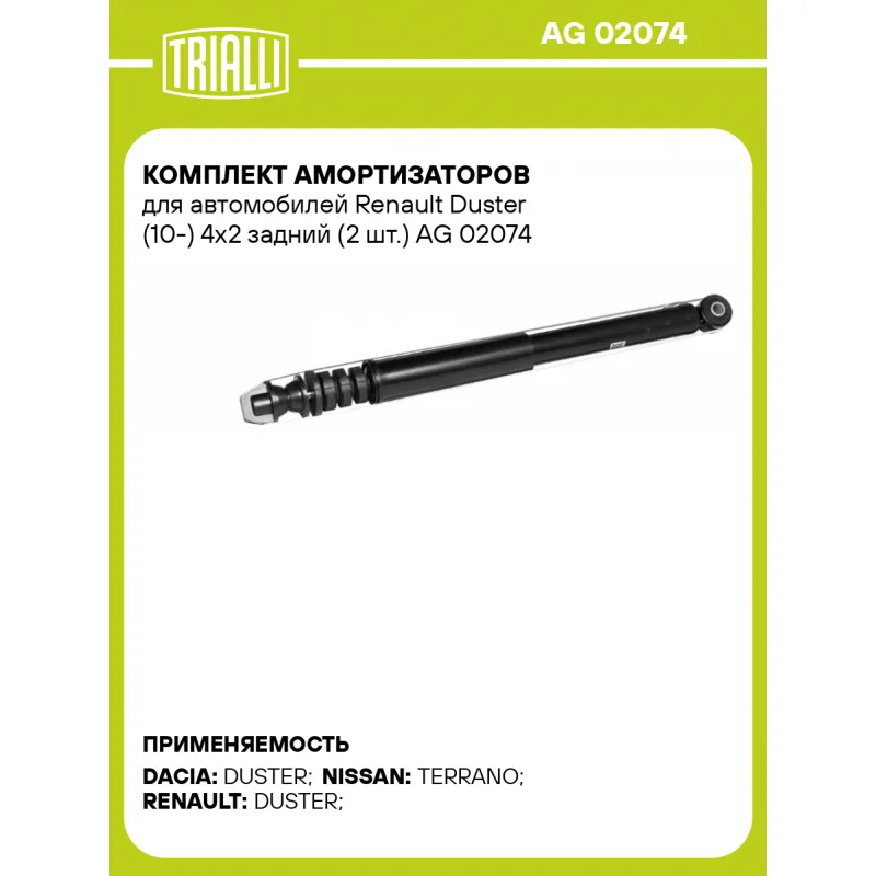 Комплект амортизаторов для автомобилей Renault Duster (10-) 4x2 задний (2 шт.) Характеристики: Артикул: AG 02074 OEM номера: 562105043R Товарная линейка: МП-серия Вид амортизатора: Масляный с газовым подпором низкого давления Тип верхнего крепления: Шток Тип нижнего крепления: Проушина/сайлентблок Диаметр корпуса, мм: 38,5 Диаметр штока, мм: 12,5 Ход штока, мм: 242 Размер резьбы штока: M9x1.0 Тип амортизатора: Двухтрубный, гидравлический Ось (сторона установки): Сзади, слева/справа Дополнительная информация: Упаковка изделия может отличаться от представленной на фото Присоединительная длина 2, мм: 667 Присоединительная длина 1, мм: 425 Гарантийный срок: 2 года/60 000 км Комплектация: Амортизатор задний - 2 шт Подушка резиновая - 4 шт Гайка крепежная - 2 шт Отбойник из термоэластопласта - 2 шт Кожух пылезащитный - 2 шт Шарнир резинометаллический - 2 шт Гарантия: от 1 года.