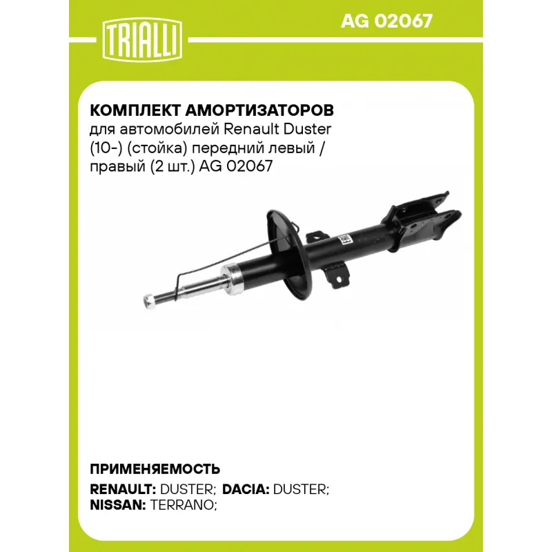 Комплект амортизаторов для автомобилей Renault Duster (10-) (стойка) передний левый / правый (2 шт.) Характеристики: Артикул: AG 02067 OEM номера: 54303-00Q0M, 543029233R , 8200813791, 543026656R, 543020142R, 543025648R, 543026312R, 543029162R, 543029903R, 543028126R Товарная линейка: МП-серия Вид амортизатора: Масляный с газовым подпором низкого давления Тип верхнего крепления: Шток Тип нижнего крепления: Скоба Диаметр корпуса, мм: 45 Диаметр штока, мм: 20 Ход штока, мм: 157 Размер резьбы штока: M14x1.5 Тип амортизатора: Двухтрубный, гидравлический Ось (сторона установки): Спереди, слева/справа Присоединительная длина 2, мм: 572 Присоединительная длина 1, мм: 415 Гарантийный срок: 2 года/60 000 км Комплектация: Амортизатор (стойка) передний - 2 шт Гайка крепежная - 2 шт Гарантия: от 1 года.