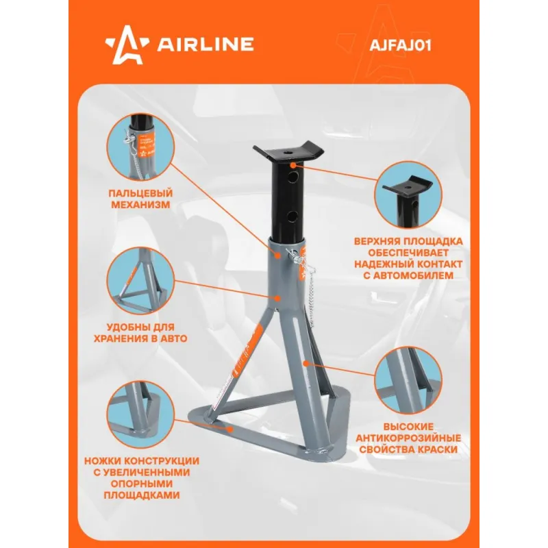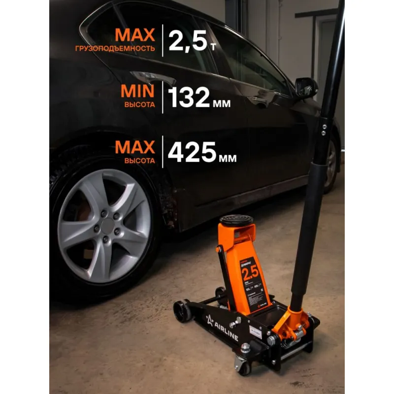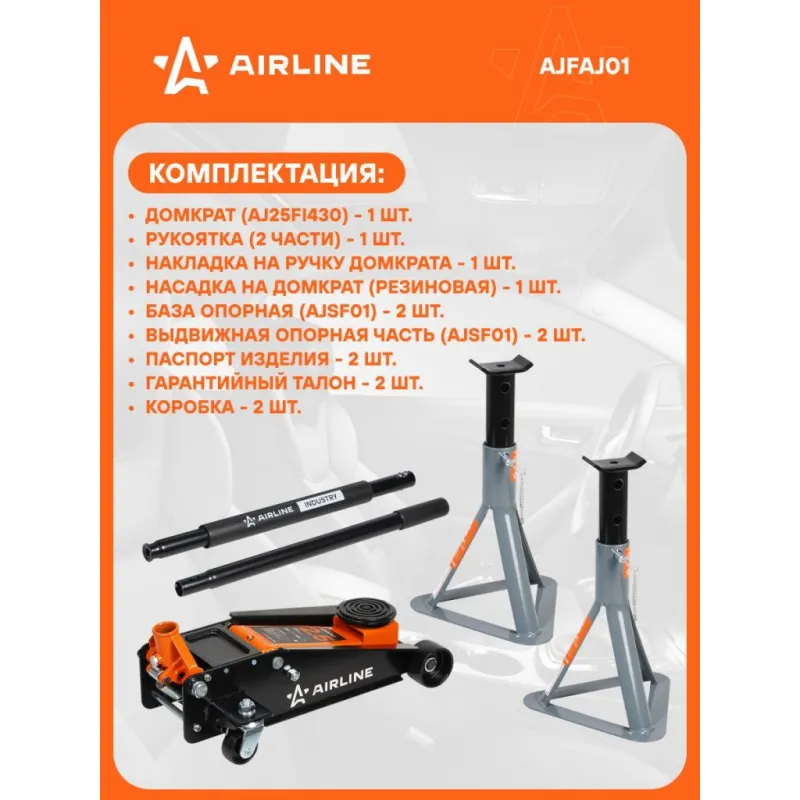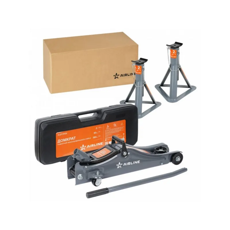 Комплект Домкрат+Стойки (домкрат подкат. 2т 130-400мм INDUSTRY и две стойки 2т 265-365мм) Описание: Подкатной гидравлический домкрат AIRLINE, рассчитанный на 2,5 тонны и имеющий диапазон подъема 132-425 мм, представляет собой надежное устройство, предназначенное для подъема грузов и мебели, а также легковых автомобилей, внедорожников и кроссоверов, максимальная масса которых составляет до 2 т. Этот домкрат разработан для профессионального использования в автосервисах и шиномонтажных мастерских, а также для личного применения. Он отличается высокой устойчивостью, эргономичной рукояткой, способностью выдерживать морозы до -40 °C, а также наличием накладки на ручку и резиновой накладки, что обеспечивает безопасность и комфорт в работе. Страховочные стойки с нагрузкой 2 тонны и диапазоном высоты от 265 до 365 мм представляют собой надежное средство для страховки и удержания автомобиля на требуемой высоте. Стойки устанавливаются в определенных точках (под осями или под специальными площадками на раме). Фиксация производится с помощью пальцевого механизма. В комплекте 2 опоры. Преимущества: - Состав: сталь, чугун; - Пальцевый механизм; - Высокие антикоррозийные свойства краски; - Ножки конструкции с увеличенными опорными площадками; - Верхняя площадка обеспечивает надежный контакт; - Удобны для хранения; Несколько правил при работе: 1. Запрещается превышать грузоподъемность домкрата! 2. Не должен использоваться в качестве подставки для поднятия грузов. 3. При подъеме груза убедитесь, что нагрузка приходится на центр опорной площадки. 4. Рекомендуется использовать страховочные подставки и противооткатные упоры. Страховочный набор станет незаменимым помощником в вашей автомастерской и пригодится при замене деталей, колес и выполнении шиномонтажных работ. Комплект разработан для безопасного подъема и устойчивого удержания автомобилей во время ремонтных или технических операций, что делает его универсальным решением как для профессиональных автосервисов, так и для использования в домашних условиях. Характеристики: Артикул: AJFAJ01 Грузоподъемность, т: 2 Высота подхвата, мм: 130 Высота подъема, мм: 400 Комплектация: Домкрат - 1 шт Рукоятка (2 части) - 1 шт Накладка на ручку домкрата - 1 шт Насадка на домкрат (резиновая) - 1 шт База опорная (AJSF01) - 2 шт Выдвижная опорная часть - 2 шт Паспорт изделия - 2 шт Гарантийный талон - 2 шт Коробка - 2 шт Гарантия: от 1 года.