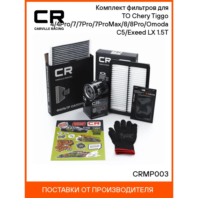Комплект фильтров для ТО Chery Tiggo 4/4Pro/7/7Pro/7ProMax/8/8Pro/Omoda C5/Exeed LX 1.5T Описание: Комплект технического обслуживания (ТО) автомобилей подходит Chery Tiggo 4 / 4Pro / 7 / 7Pro / 7ProMax / 8 / 8Pro / Omoda C5 / Exeed LX 1.5T. Если у вас есть вопросы по применяемости, мы всегда готовы помочь вам с подбором по VIN-НОМЕРУ ВАШЕГО АВТОМОБИЛЯ. Фильтр масляный CRL56001 обеспечивает эффективное отделение загрязнений и надежно удерживает продукты сгорания и износа, пыль, сажу и конденсат, загрязняющее моторное масло при эксплуатации двигателя. Материалы высокого качества, используемые в масляных фильтрах гарантируют надежность на протяжении всего межсервисного интервала. Автомобильный масляный фильтр создан для надежной работы вашего автомобиля, обеспечивая качественную защиту двигателя. Фильтр обеспечивает тонкую очистку масла, защищая двигатель от износа и продлевая срок его службы. Фильтр воздушный TR55411 предотвращает износ двигателя, очищая поступающий воздух в двигатель автомобиля от пыли, грязи и других загрязняющих частиц. Обеспечивает стабильную работу двигателя, оптимальный крутящий момент и снижает расход топлива. Высокая эффективность фильтрации: >99%. Фильтры выполнены из высококачественных фильтрующих материалов, которые обеспечивают работоспособность на всем межсервисном интервале. Фильтр салонный угольный CRVC55244 обеспечивают подачу очищенного воздуха в салон автомобиля, эффективно защищают водителя и пассажиров от воздействия пыли, сажи, смога, пыльцы и других дорожных загрязнений. Устойчивы к воздействию влаги и перепаду температур, предотвращают запотевание окон. Точные посадочные габариты исключают прохождение воздуха в обход фильтра. Производство фильтров осуществляется на высокотехнологичных автоматизированных линиях, сертифицированных стандартом IATF 16949:2016. Вся продукция испытывается в испытательных лабораториях, аккредитованных стандартами по ISO 17025: 2017 и CNAS-CL01. Комплектующие набора можно приобрести отдельно. Характеристики: Артикул: CRMP003 OEM номера: 480-1012010, T151109111, T158107011 Количество на автомобиль: 1 Комплектация: Ароматизатор "Card" Perfume Dark amber AFCA306 - 1 шт Перчатки - 1 пар Стикерпак CARVILLE RACING - 1 шт Фильтр салонный угольный - 1 шт Уплотнительное кольцо сливной пробки 481H1002041 - 1 шт Фильтр масляный - 1 шт Фильтр воздушный - 1 шт Фильтр воздушный - 1 шт Фильтр масляный - 1 шт Гарантия: от 1 года.