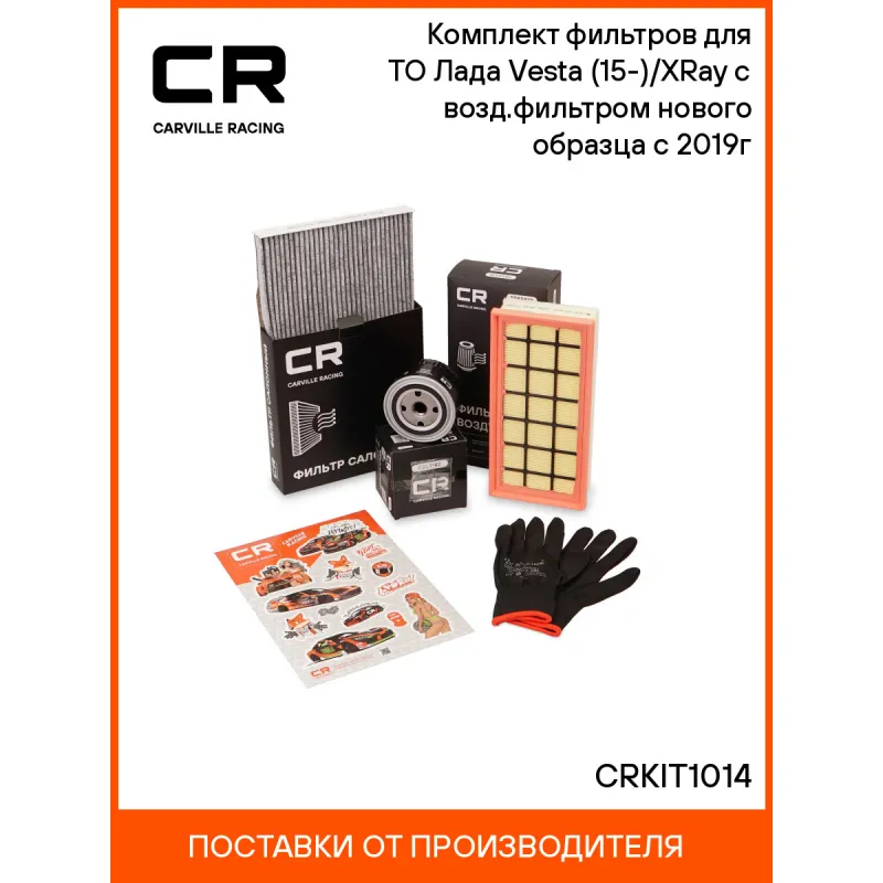 Комплект фильтров для ТО Лада Vesta (15-)/XRay (16-) с возд.фильтром нового образца с 2019г Характеристики: Артикул: CRKIT1014 OEM номера: 2108-1012005, 272773151R, 8450033130, 21080-1011062-00 Количество на автомобиль: 1 Комплектация: Перчатки - 1 пар Стикерпак CARVILLE RACING - 1 шт Фильтр салонный угольный - 1 шт Фильтр воздушный - 1 шт Фильтр масляный - 1 шт Фильтр масляный - 1 шт Фильтр салонный угольный - 1 шт Уплотнительное кольцо сливной пробки 21080-1011062-00 - 1 шт Гарантия: от 1 года.