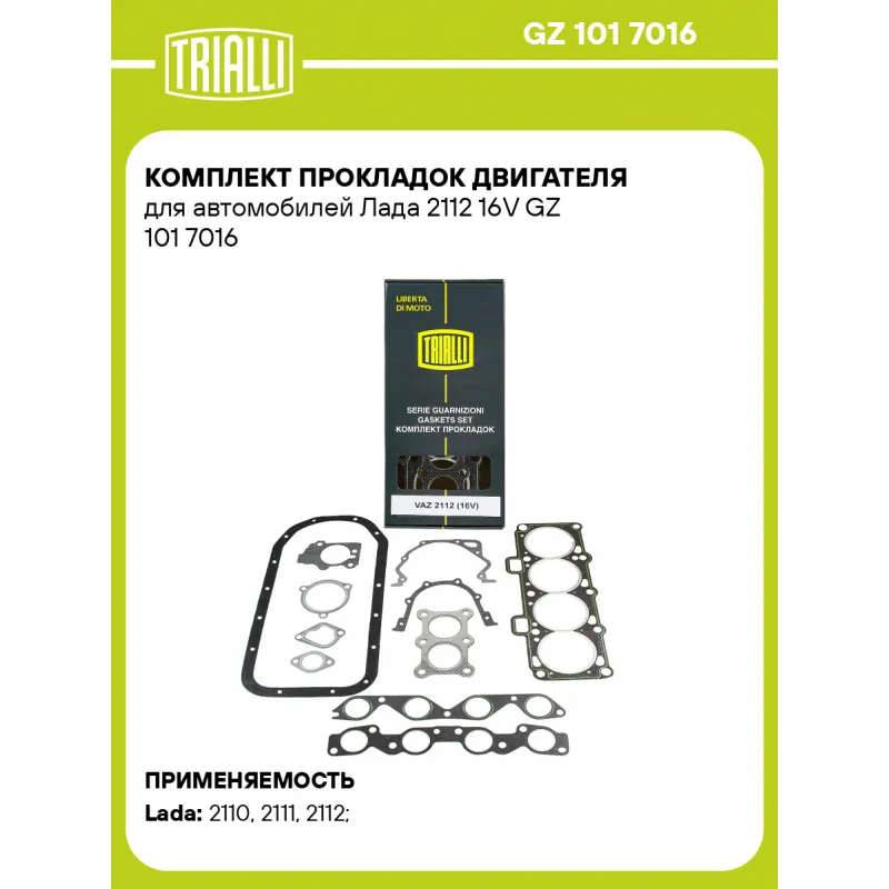 Комплект прокладок двигателя для автомобилей Лада 2112 16V Характеристики: Артикул: GZ 101 7016 OEM номера: 2108-1009070, 2112-1148015, 2108-1303017, 2112-1008081, 2112-1008089, 2108-1011065, 21081307042, 2108-1303067, 2112-1203020, 2108-1005155, 2112-1003078, 2112-1003076, 2112-1003020 Гарантийный срок: 2 года/60 000 км. Количество на автомобиль: 1 Сопутствующие товары:: CV 537,PM 783,GZ 101 2015 Особенности конструкции:: с герметиком для клапанной крышки Материал: Безасбестовый Трансмиссия: М Дополнительная информация: с герметиком для клапанной крышки ABS: - Подходит для авто: ВАЗ 2110, 2111, 2112 Для проверки применяемости отправьте VIN автомобиля через вкладку "Есть вопросы о товаре?" Гарантия: от 1 года.