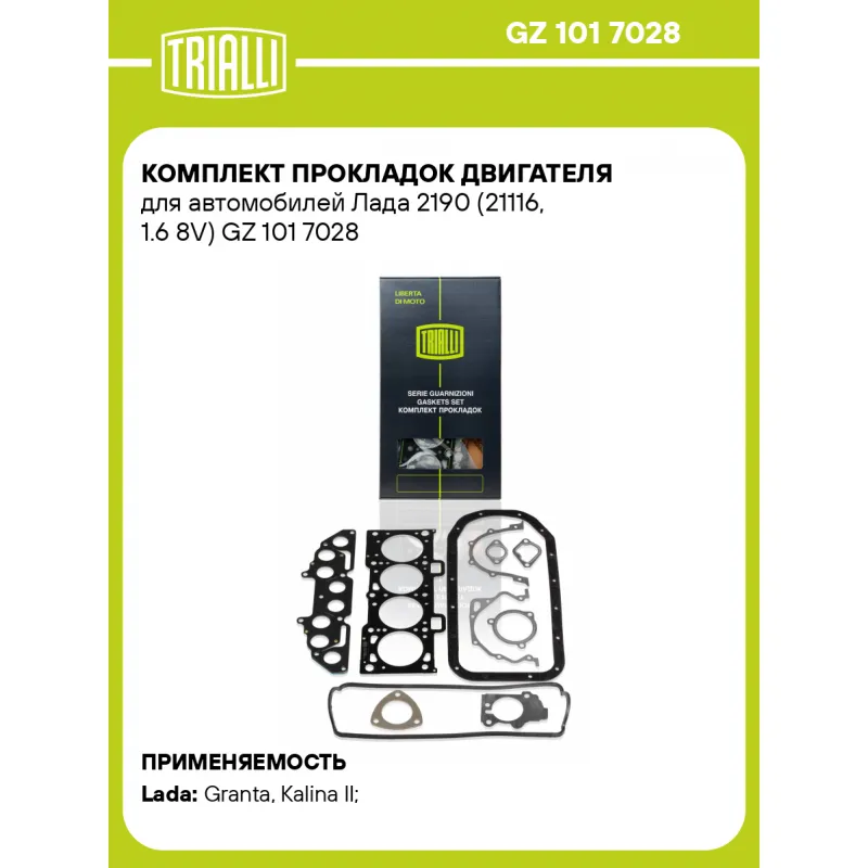 Комплект прокладок двигателя для автомобилей Лада 2190 (21116, 1.6 8V) Характеристики: Артикул: GZ 101 7028 OEM номера: 21116-1003020, 2110-1203021, 2108-1005155, 2108-1011065, 2108-1303067, 2108-1303017, 2108-1009070, 2108-1003270, 21114-1008080, 21081307042 Гарантийный срок: 2 года/60 000 км. Количество на автомобиль: 1 Материал: безасбестовая Трансмиссия: М ABS: - Подходит для авто: ВАЗ Granta (10-), Kalina II (13-) Для проверки применяемости отправьте VIN автомобиля через вкладку "Есть вопросы о товаре?" Гарантия: от 1 года.