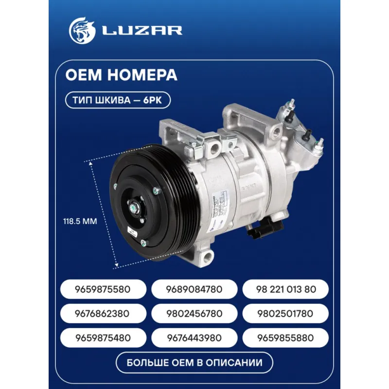 Компреccор кондиционера для автомобилей C4 (04-)/308 (07-) (тип Denso) Характеристики: Артикул: LCAC 2016 OEM номера: 6453WH, 648740, 648741, 9659875580, 9689084780, 6487.39, 9822101780, 9826268480, 9811575580, 648742, 648743, 9659855880, 9684075880, 9689084880, 9807722880, 9659875480, 9676443980, 6487.38, 6453WJ, 6453YQ, 6453YR, 98 221 013 80, 6453.WG, 9676862380, 6453WF, 9802456780, 9802501780, 4471501740 Сопутствующий товар: Датчики давления хладагента: LRPS 2080 Количество на автомобиль: 1 Объём заправленного масла, мл: 90±10 Вид хладагента: R-134a Тип шкива: 6PK Диаметр шкива, мм: 118.5 Вид заправленного масла: PAG 46 Ид.№ компрессора: 6SEL16C Сопутствующий товар: Радиаторы кондиционера (конденсеры): LRAC 2007; LRAC 2008; LRAC 20GH; LRAC 20GK Сопутствующий товар: Клапаны расширительные кондиционера (ТРВ): LTRV 2070; LTRV 2080 Сопутствующий товар: Управляющие клапаны: LCCV 2002 Комплектующие компрессора: LCCV 2002 Мощность, кВт: 2 Подходит для авто: Peugeot 308 (07-), 508 (11-), 5008 (09-), Partner (08-) Citroen C4 (10-), C4 Picasso (06-), C4 Picasso (06-), DS3 (10-), DS3 (10-), DS4 (11-), Berlingo II (08-), C4 (04-), C4 (04-), DS4 (11-), DS5 (12-) Для проверки применяемости отправьте VIN автомобиля через вкладку "Есть вопросы о товаре?" Комплектация: Компрессор кондиционера Паспорт изделия Уплотнительные колечки - 2 шт Гарантия: от 1 года.