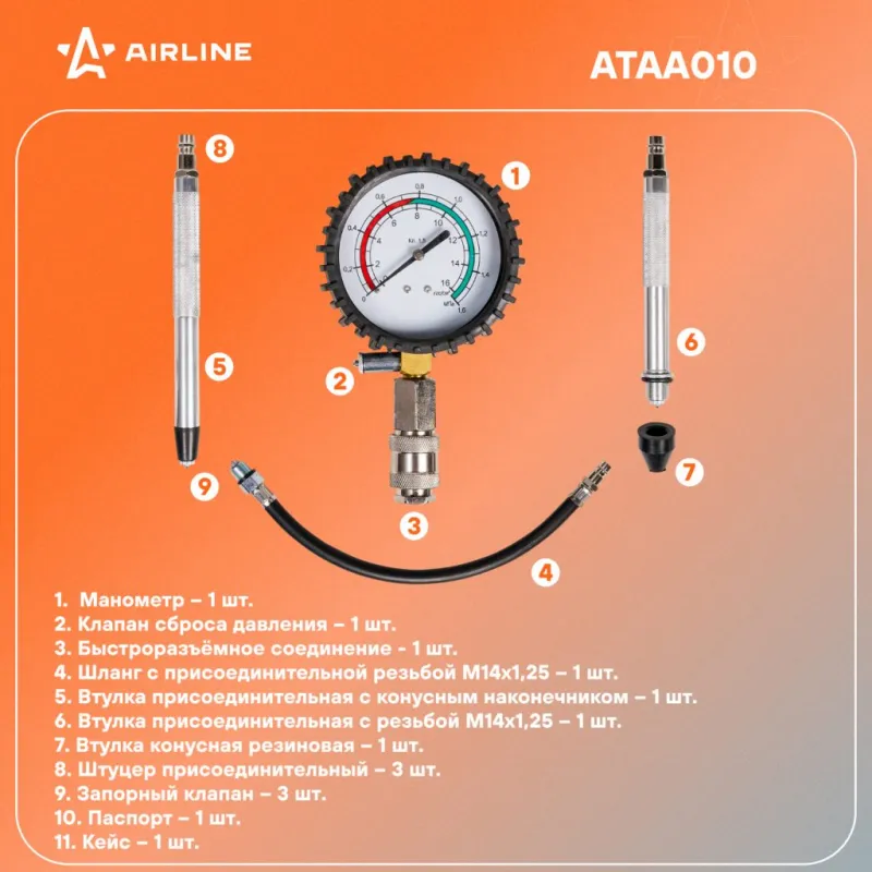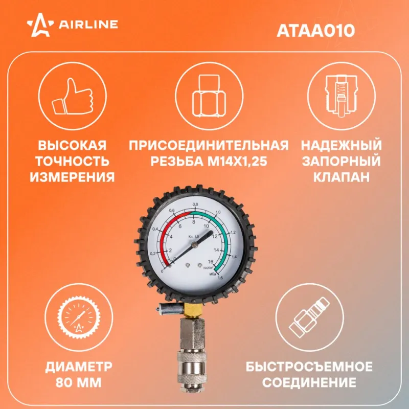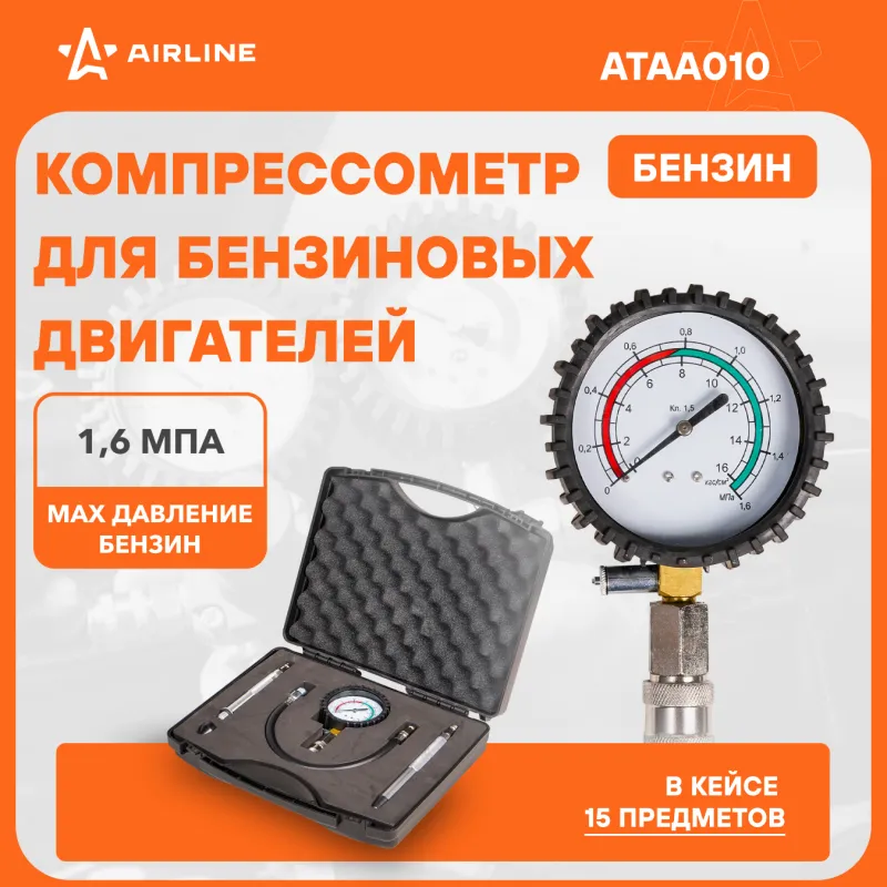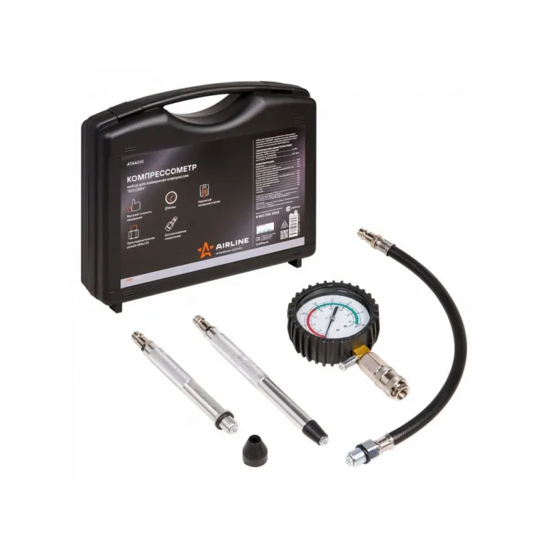 Компрессометр для бензиновых двигателей PRO, набор 5пр., пласт. кейс Описание: Измеритель состоит из манометра, присоединительной части и переходников. Манометр защищён резиновым чехлом. Характеристики: Артикул: ATAA010 Погрешность измерения, не более МПа (кг/см.кв): 0.01(0.1) Присоединительная резьба: M14x1.25 Верхний предел измерения давления, МПа (кгс/см.кв): 1.6(16) Относительная влажность воздуха при эксплуатации, %: 30-80 Температура окружающего воздуха при эксплуатации, °С: -60 - +60 Комплектация: Манометр - 1 шт Клапан сброса давления - 1 шт Быстроразъёмное соединение - 1 шт Шланг с присоединительной резьбой М14*1,25 - 1 шт Втулка присоединительная с конусным наконечником - 1 шт Втулка присоединительная с резьбой М14*1,25 - 1 шт Втулка конусная резиновая - 1 шт Штуцер присоединительный - 3 шт Запорный клапан - 3 шт Паспорт - 1 шт Кейс - 1 шт Гарантия: от 1 года.