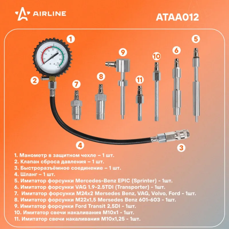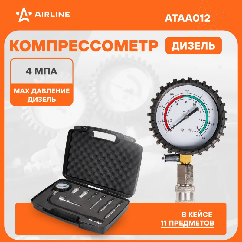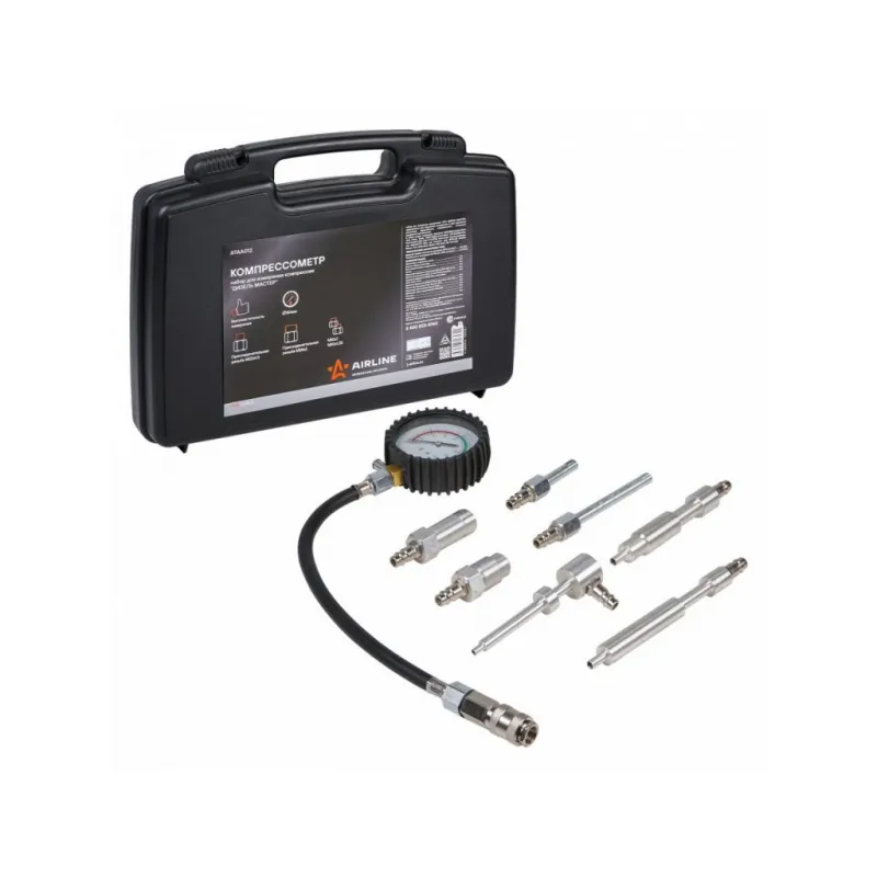 Компрессометр для дизельных двигателей PRO, пласт. кейс Описание: Измеритель состоит из манометра, присоединительной части и переходников. Манометр защищён резиновым чехлом. Характеристики: Артикул: ATAA012 Погрешность измерения, не более МПа (кг/см.кв): 0.01(0.1) Присоединительная резьба: M10x1, M10x1.5, М24х2, М22х1.5 Верхний предел измерения давления, МПа (кгс/см.кв): 4.0(40) Относительная влажность воздуха при эксплуатации, %: 30-80 Температура окружающего воздуха при эксплуатации, °С: -60 - +60 Комплектация: Манометр - 1 шт Шланг - 1 шт Имитатор форсунки Mercedes-Benz EPIC (Sprinter) - 1 шт Имитатор форсунки VAG 1.9-2.5TDI (Transporter) - 1 шт Имитатор форсунки М24*2 Mersedes Benz, VAG, Volvo, Ford - 1 шт Имитатор форсунки М22*1,5 Mersedes Benz 601-603 - 1 шт Имитатор форсунки Ford Transit 2.5DI - 1 шт Имитатор свечи накаливания М10*1 - 1 шт Имитатор свечи накаливания М10*1,25 - 1 шт Паспорт - 1 шт Кейс - 1 шт Гарантия: от 1 года.