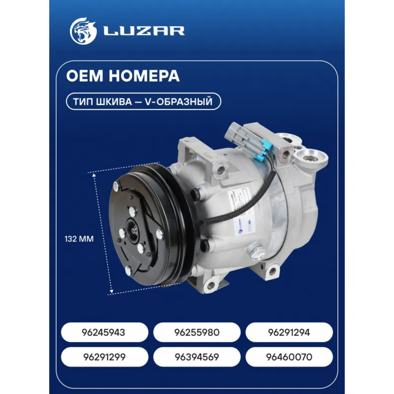 Компрессор кондиционера Chevrolet Lanos (02-) 1.5i Характеристики: Артикул: LCAC 0563 OEM номера: 96245943, 96255980, 96291294, 96291299, 96394569, 96460070 Сопутствующий товар: Радиаторы кондиционера (конденсеры): LRAC 0585, LRAC CHLs0235 Сопутствующий товар: Ресиверы-осушители: LCR 0535 Количество на автомобиль: 1 Объём заправленного масла, мл: 200±10 Вид хладагента: R134a Тип шкива: V образный Диаметр шкива, мм: 132 Вид заправленного масла: PAG 46 Ид.№ компрессора: V5 Мощность, кВт: 2,5 Подходит для авто: Chevrolet Lanos (05-), Lanos (97-) Для проверки применяемости отправьте VIN автомобиля через вкладку "Есть вопросы о товаре?" Комплектация: Компрессор кондиционера Паспорт изделия Уплотнительные кольца - 2 шт Гарантия: от 1 года.