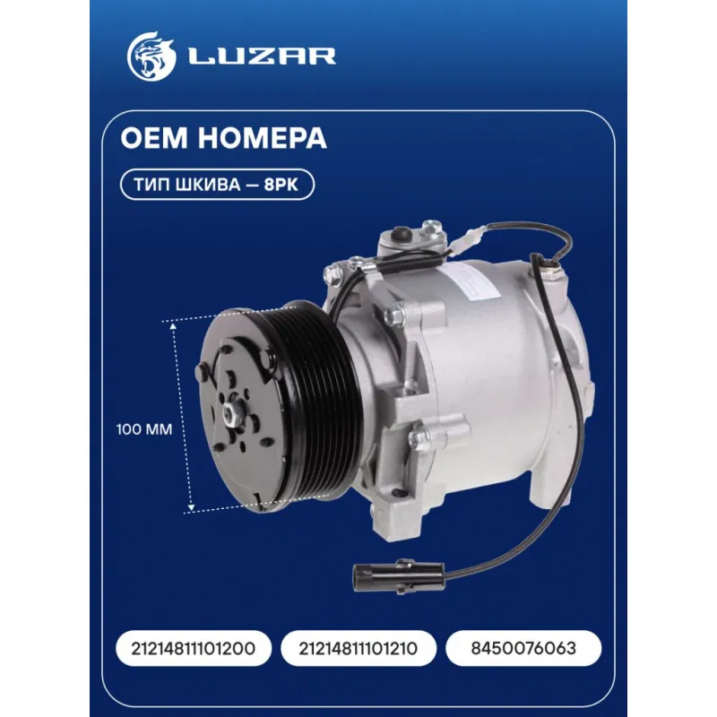 Компрессор кондиционера для автомобилей 4x4 Urban (14-) Характеристики: Артикул: LCAC 01214 OEM номера: 21214811101200, 21214811101210, 8450076063 Сопутствующий товар: Радиаторы кондиционера (конденсеры): LRAC 01214 Ид.№ компрессора: SCROLL COMPRESSOR Количество на автомобиль: 1 Объём заправленного масла, мл: 120 Вид хладагента: R134a Тип шкива: 8PK Диаметр шкива, мм: 100 Вид заправленного масла: PAG 56 Мощность, кВт: 2 Подходит для авто: ВАЗ 2121 Для проверки применяемости отправьте VIN автомобиля через вкладку "Есть вопросы о товаре?" Комплектация: Компрессор кондиционера Паспорт изделия Гарантия: от 1 года.