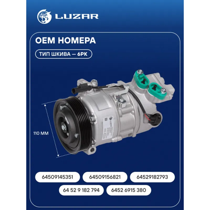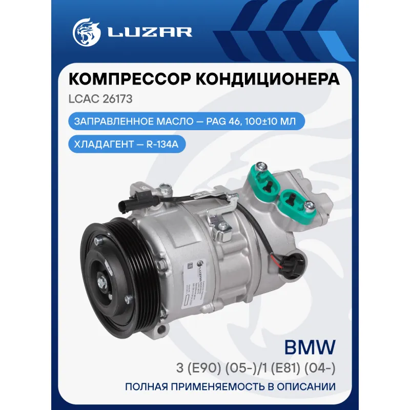 Компрессор кондиционера для автомобилей BMW 3 (E90) (05-)/1 (E81) (04-) Характеристики: Артикул: LCAC 26173 OEM номера: 64509145351, 64509156821, 64529182793, 64 52 9 182 794, 6452 6915 380 Сопутствующий товар: Датчики давления хладагента: LRPS 2600 Комплектующие компрессора: LCCV 1802 Количество на автомобиль: 1 Объём заправленного масла, мл: 100±10 Вид хладагента: R134a Тип шкива: 6PK Диаметр шкива, мм: 110 Вид заправленного масла: PAG 46 Ид.№ компрессора: CSE613C Сопутствующий товар: Радиаторы кондиционера (конденсеры): LRAC 26173 Сопутствующий товар: Клапаны расширительные кондиционера (ТРВ): LTRV 26173 Мощность, кВт: 2,5 Подходит для авто: BMW 1 E81/E87 (04-), 3 E90 (05-) Для проверки применяемости отправьте VIN автомобиля через вкладку "Есть вопросы о товаре?" Комплектация: Компрессор кондиционера Паспорт изделия Уплотнительные колечки - 2 шт Гарантия: от 1 года.