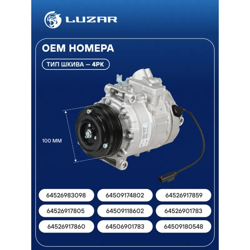 Компрессор кондиционера для автомобилей BMW 5 (E60) (03-)/7 (E65) (03-) Характеристики: Артикул: LCAC 2660 OEM номера: 64526983098, 64509174802, 64526917859, 64526917805, 64509118602, 64526901783, 64526917860, 64506901783, 64509180548 Сопутствующий товар: Датчики давления хладагента: LRPS 2600 Сопутствующий товар: Управляющие клапаны: LCCV 1802 Комплектующие компрессора: LCCV 1802 Количество на автомобиль: 1 Объём заправленного масла, мл: 190±10 Вид хладагента: R-134a Тип шкива: 4PK Диаметр шкива, мм: 100 Вид заправленного масла: PAG 46 Ид.№ компрессора: 7SEU17C Сопутствующий товар: Радиаторы кондиционера (конденсеры): LRAC 26109 Сопутствующий товар: Клапаны расширительные кондиционера (ТРВ): LTRV 2626 Мощность, кВт: 2,5 Подходит для авто: BMW 5 E60 (03-), 5 E60 (03-), 7 E65/E66 (01-) Для проверки применяемости отправьте VIN автомобиля через вкладку "Есть вопросы о товаре?" Комплектация: Компрессор кондиционера Паспорт изделия Гарантия: от 1 года.