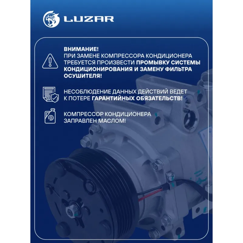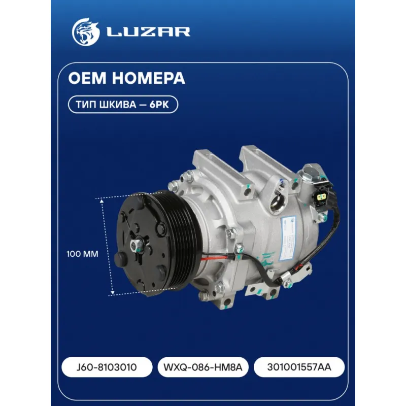 Компрессор кондиционера для автомобилей Chery Tiggo 4 (17-) 1.5i/1.5T Характеристики: Артикул: LCAC 3037 OEM номера: J60-8103010, WXQ-086-HM8A, 301001557AA Сопутствующий товар: Радиаторы кондиционера (конденсеры): LRAC 3036, LRAC 3037; Количество на автомобиль: 1 Объём заправленного масла, мл: 130 Вид хладагента: R134a Тип шкива: 6PK Диаметр шкива, мм: 100 Вид заправленного масла: PAG 56 Ид.№ компрессора: WXH-086-HM0 Мощность, кВт: 2,5 Подходит для авто: Kaiyi E5 (21-) Chery Tiggo 4 (17-), Tiggo 4 Pro (20-) Jetour Dashing (22-), X90 plus (21-) Для проверки применяемости отправьте VIN автомобиля через вкладку "Есть вопросы о товаре?" Комплектация: Компрессор кондиционера Паспорт изделия Гарантия: от 1 года.