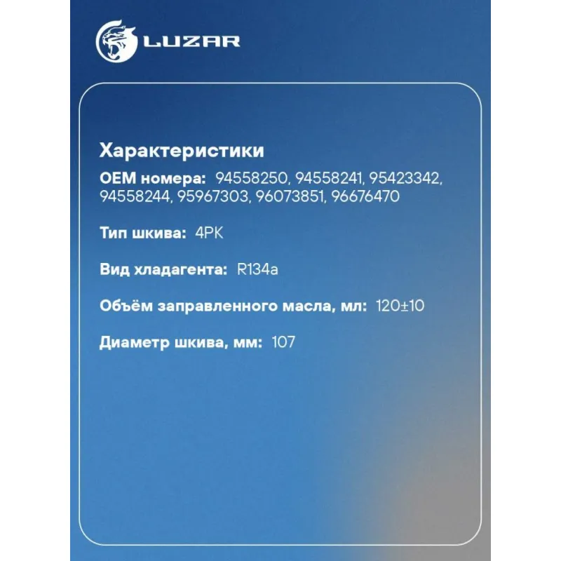 Компрессор кондиционера для автомобилей Chevrolet Spark M300 (09-)/Ravon R2 (16-) Характеристики: Артикул: LCAC 0520 OEM номера: 94558250, 94558241, 95423342, 94558244, 95967303, 96073851, 96676470 Тип шкива: 4PK Вид хладагента: R134a Объём заправленного масла, мл: 120±10 Диаметр шкива, мм: 107 Сопутствующий товар: Радиаторы кондиционера (конденсеры): LRAC 05141 Ид.№ компрессора: CSP11 Вид заправленного масла: PAG46 Количество на автомобиль: 1 Мощность, кВт: 2,5 Комплектация: Компрессор кондиционера Паспорт изделия Гарантия: от 1 года.
