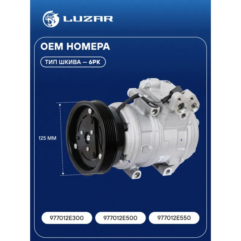 Компрессор кондиционера для автомобилей Hyundai Tucson (04-)/Kia Sportage (04-) 2.0D (тип Dowoon) Характеристики: Артикул: LCAC 0829 OEM номера: 977012E300, 977012E500, 977012E550 Сопутствующий товар: Ресиверы-осушители: LCR 0806 Сопутствующий товар: Клапаны расширительные кондиционера (ТРВ): LTRV 0880 Количество на автомобиль: 1 Объём заправленного масла, мл: 200±10 Вид хладагента: R134a Тип шкива: 6PK Диаметр шкива, мм: 125 Вид заправленного масла: PAG 46 Ид.№ компрессора: 10PA17 Сопутствующий товар: Радиаторы кондиционера (конденсеры): LRAC 08E2 Мощность, кВт: 2,5 Подходит для авто: Hyundai Tucson I (04-) Kia Sportage II (04-) Для проверки применяемости отправьте VIN автомобиля через вкладку "Есть вопросы о товаре?" Комплектация: Компрессор кондиционера Паспорт изделия Уплотнительные кольца - 2 шт Гарантия: от 1 года.