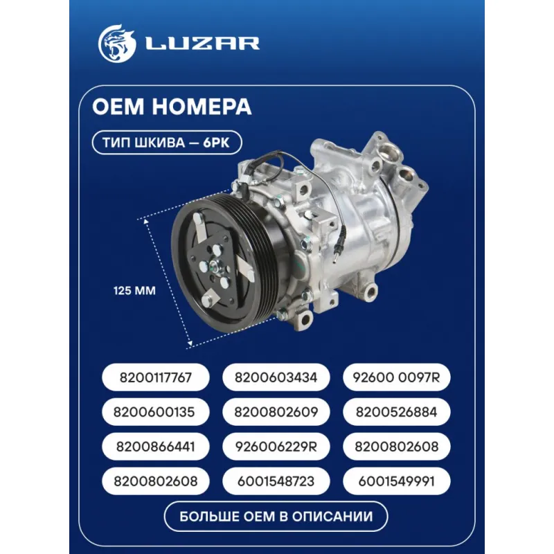Компрессор кондиционера для автомобилей Logan (08-)/Duster (10-)/Largus (12-) Характеристики: Артикул: LCAC 0998 OEM номера: 8200117767, 8200603434, 8200526884, 8200600135, 8200802609, 8200866443, 2763000Q3G, 92600 0097R, 8200866441, 926006229R, 6001548723, 6001549991, 8200802608, 82 00 716 562, 27630-00QAE, 82 00 866 436, 2763000QAL, 7711135926, 926005474R, 77 00 273 801, 82 00 600 117, 88 00 315 744, 82 00 953 358, 82 00 315 744, 77 01 499 969 Сопутствующий товар: Датчики давления хладагента: LRPS 0997 Количество на автомобиль: 1 Объём заправленного масла, мл: 135±20 Вид хладагента: HFC-134a Тип шкива: 6PK Диаметр шкива, мм: 125 Вид заправленного масла: PAG 46 Ид.№ компрессора: SD7V16 Сопутствующий товар: Радиаторы кондиционера (конденсеры): LRAC 0950; LRAC 0961; LRAC RELo04360 Сопутствующий товар: Клапаны расширительные кондиционера (ТРВ): LTRV 0998 Сопутствующий товар: Ресиверы-осушители: LCR 0960 Сопутствующие товары:: LMAC 0902; LMCC 0902 Комплектующие компрессора: LMAC 0902, LMCC 0902, LCP 0902 Мощность, кВт: 2 Подходит для авто: Renault Sandero I (09-), Logan (04-), Duster (10-) Dacia Logan (04-), Sandero (09-), Duster (10-) ВАЗ Largus (12-) Nissan Almera G15 (12-) Для проверки применяемости отправьте VIN автомобиля через вкладку "Есть вопросы о товаре?" Комплектация: Компрессор кондиционера Паспорт изделия Гарантия: от 1 года.
