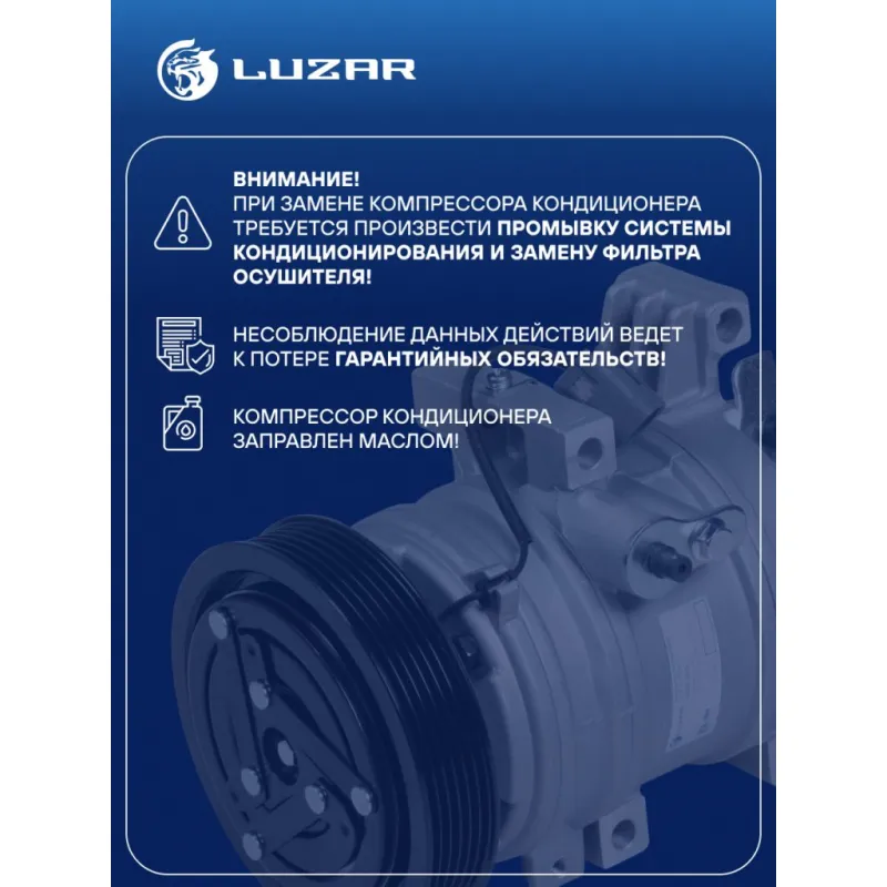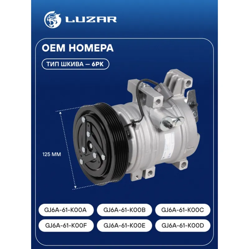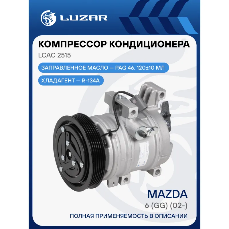 Компрессор кондиционера для автомобилей Mazda 6 (GG) (02-) Характеристики: Артикул: LCAC 2515 OEM номера: GJ6A-61-K00A, GJ6A-61-K00B, GJ6A-61-K00C, GJ6A-61-K00F, GJ6A-61-K00E, GJ6A-61-K00D Количество на автомобиль: 1 Объём заправленного масла, мл: 120±10 Вид хладагента: R-134a Тип шкива: 6PK Диаметр шкива, мм: 125 Вид заправленного масла: PAG 46 Ид.№ компрессора: H12 Сопутствующий товар: Радиаторы кондиционера (конденсеры): LRAC 2510 Сопутствующий товар: Клапаны расширительные кондиционера (ТРВ): LTRV 2530 Сопутствующий товар: Ресиверы-осушители: LCR 2501 Мощность, кВт: 2 Подходит для авто: Mazda 3 (03-), 6 (02-), CX-7 (07-) Для проверки применяемости отправьте VIN автомобиля через вкладку "Есть вопросы о товаре?" Комплектация: Компрессор кондиционера Паспорт изделия Гарантия: от 1 года.