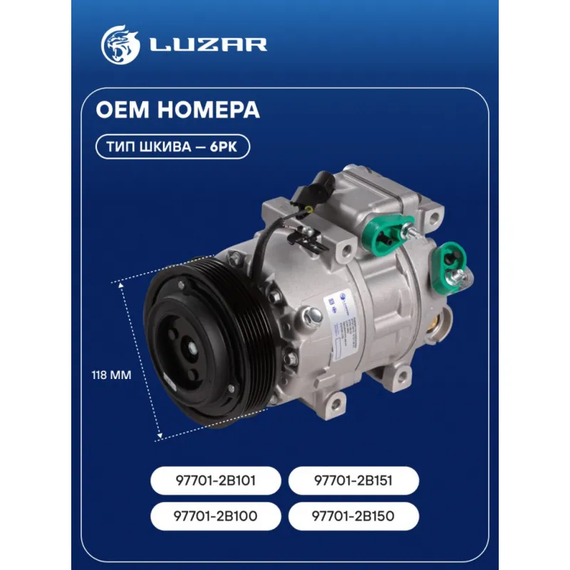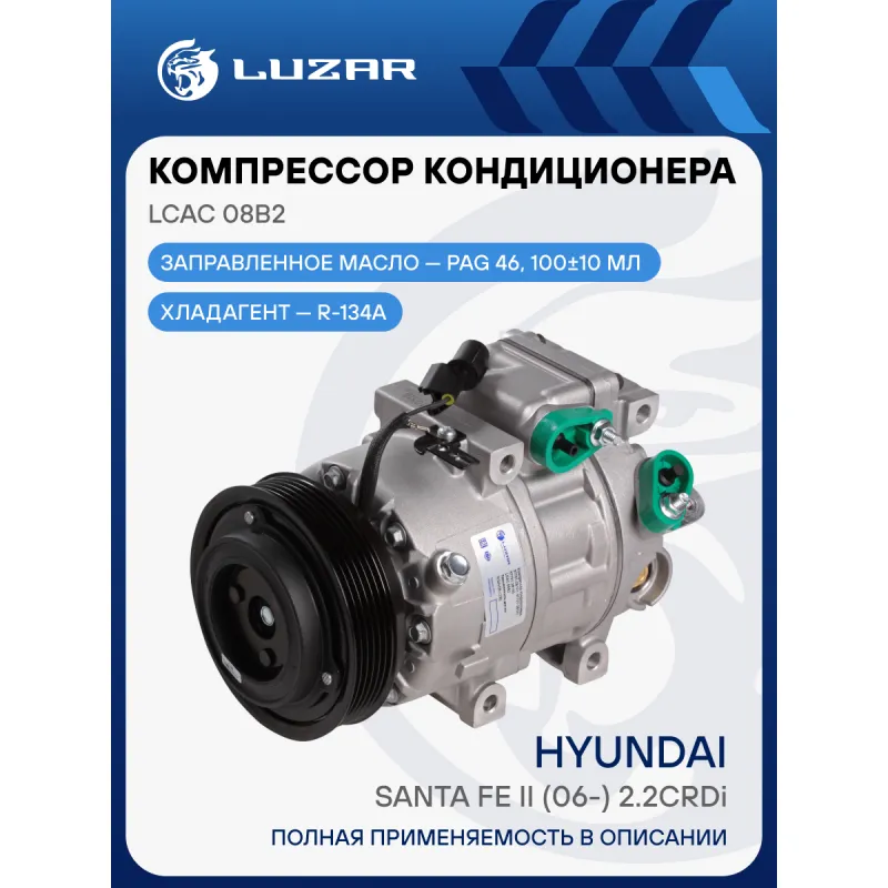 Компрессор кондиционера для автомобилей Santa Fe II (06-) 2.2CRDi Характеристики: Артикул: LCAC 08B2 OEM номера: 97701-2B101, 97701-2B151, 97701-2B100, 97701-2B150 Количество на автомобиль: 1 Объём заправленного масла, мл: 100±10 Вид хладагента: R-134a Тип шкива: 6PK Диаметр шкива, мм: 118 Вид заправленного масла: PAG 46 Ид.№ компрессора: VS-18 Сопутствующий товар: Радиаторы кондиционера (конденсеры): LRAC 0863 Сопутствующий товар: Клапаны расширительные кондиционера (ТРВ): LTRV 0806; LTRV 0808 Сопутствующий товар: Ресиверы-осушители: LCD 0801 Мощность, кВт: 2,5 Подходит для авто: Hyundai Santa Fe II (06-) Для проверки применяемости отправьте VIN автомобиля через вкладку "Есть вопросы о товаре?" Комплектация: Компрессор кондиционера Паспорт изделия Уплотнительные колечки - 2 шт Гарантия: от 1 года.