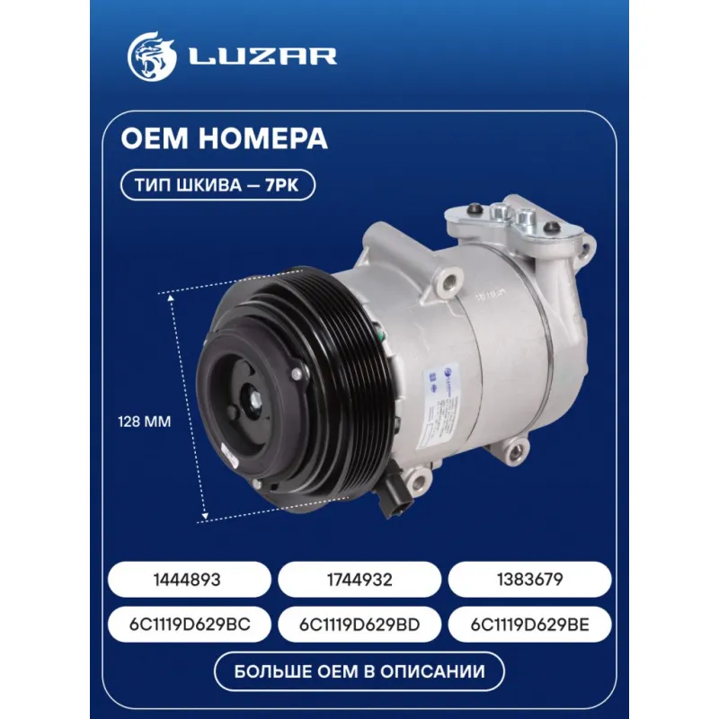 Компрессор кондиционера для автомобилей Transit VII (06-) 2.4TDCi Характеристики: Артикул: LCAC 1089 OEM номера: 1444893, 1744932, 1383679, 1421335, 6C1119D629BC, 6C1119D629BD, 6C1119D629BE Количество на автомобиль: 1 Объём заправленного масла, мл: 100±10 Вид хладагента: R-134a Тип шкива: 7PK Диаметр шкива, мм: 128 Вид заправленного масла: PAG 46 Ид.№ компрессора: VS-16 Сопутствующий товар: Радиаторы кондиционера (конденсеры): LRAC 10CC Мощность, кВт: 2,5 Подходит для авто: Ford Transit VII (06-) Для проверки применяемости отправьте VIN автомобиля через вкладку "Есть вопросы о товаре?" Комплектация: Компрессор кондиицонера Паспорт изделия Уплотнительные колечки - 2 шт Гарантия: от 1 года.