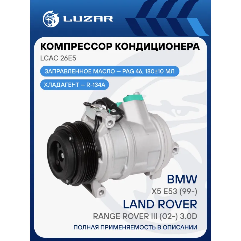 Компрессор кондиционера для автомобилей X5 (E53)/Range Rover III (02-) 3.0d Характеристики: Артикул: LCAC 26E5 OEM номера: 64528377067, JPB000110, 64526921650, LR012793 Сопутствующий товар: Датчики давления хладагента: LRPS 2600 Ид.№ компрессора: 10ZP17 Количество на автомобиль: 1 Объём заправленного масла, мл: 180±10 Вид хладагента: R134a Тип шкива: 5PK Диаметр шкива, мм: 110 Вид заправленного масла: PAG 46 Сопутствующий товар: Радиаторы кондиционера (конденсеры): LRAC 1011 Сопутствующий товар: Клапаны расширительные кондиционера (ТРВ): LTRV 2625 Мощность, кВт: 2,5 Подходит для авто: BMW X5 E53 (99-), X5 E53 (99-) Land Rover Range Rover III (02-) Для проверки применяемости отправьте VIN автомобиля через вкладку "Есть вопросы о товаре?" Комплектация: Компрессор кондиционера Паспорт изделия Уплотнительные колечки - 2 шт Гарантия: от 1 года.