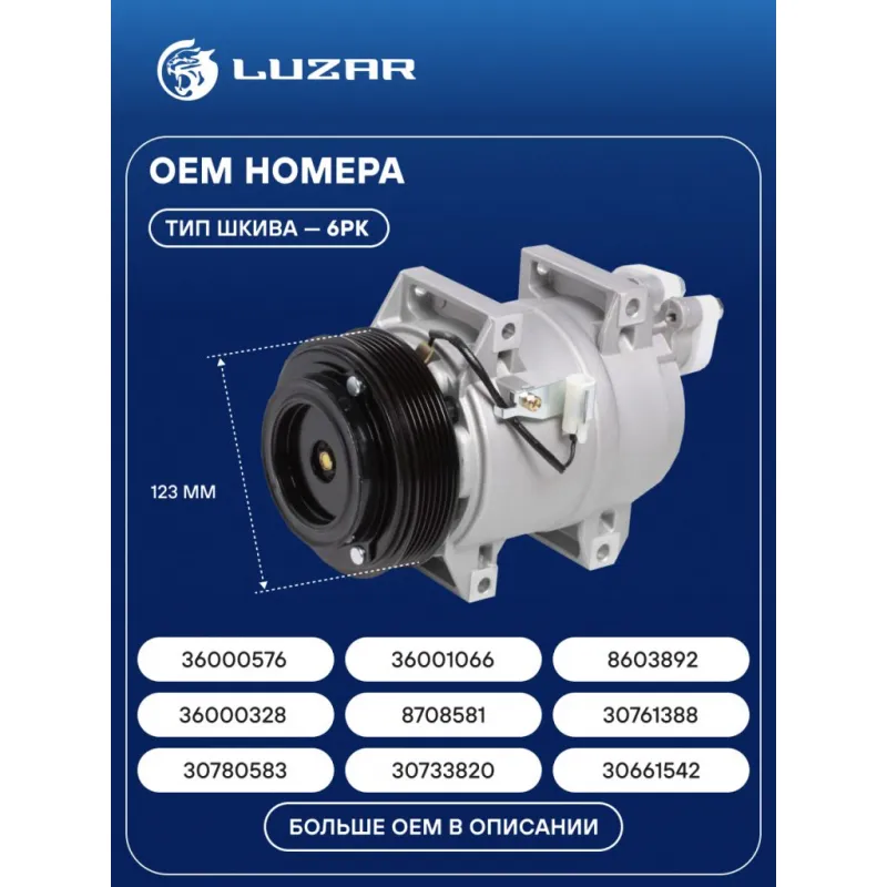 Компрессор кондиционера для автомобилей XC90 (02-) 2.4D/2.5T Характеристики: Артикул: LCAC 1093 OEM номера: 36000576, 36001066, 8603892, 36000328, 8708581, 30761388, 30780583, 30733820, 30661542, 30780584, 8684287, 8602998, 8684284, 1201361, 8602359, 8602622, 8603891, 36000327, 8650273, 9190394, 30665339, 30761389, 30780326, 8602522, 30742206, 8683632, 36050585 Количество на автомобиль: 1 Объём заправленного масла, мл: 150 Вид хладагента: R134a Тип шкива: 6PK Диаметр шкива, мм: 123 Вид заправленного масла: PAG 46 Ид.№ компрессора: DKS17D Сопутствующий товар: Радиаторы кондиционера (конденсеры): LRAC 1055; LRAC 1056; LRAC 1057; LRAC 1058 Сопутствующий товар: Клапаны расширительные кондиционера (ТРВ): LTRV 1092; LTRV 1093 Сопутствующий товар: Ресиверы-осушители: LCR 1005 Мощность, кВт: 2,5 Подходит для авто: Volvo XC90 (02-), XC70 (97-), V70 (00-), S80 (98-), S60 (00-), S80 (98-) Для проверки применяемости отправьте VIN автомобиля через вкладку "Есть вопросы о товаре?" Комплектация: Компрессор кондиционера Паспорт изделия Гарантия: от 1 года.