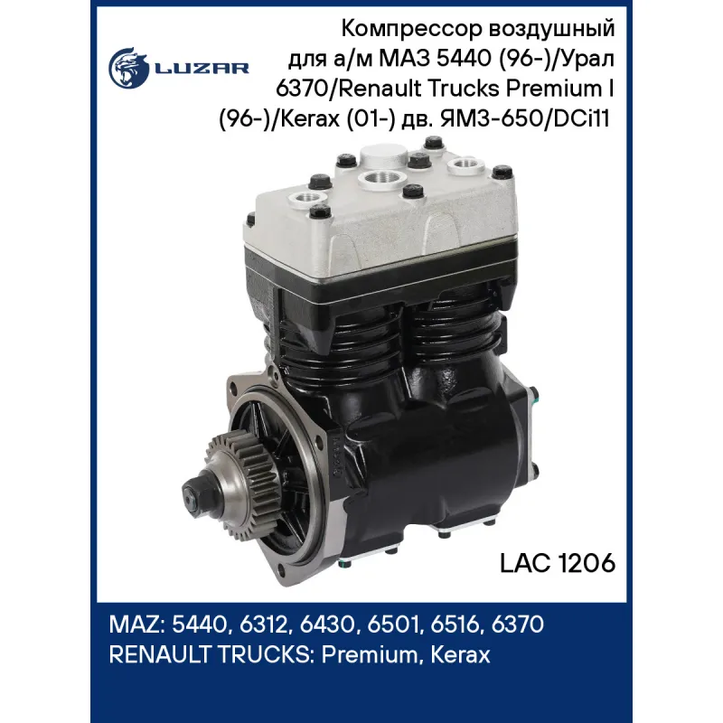 Компрессор воздушный для а/м МАЗ 5440 (96-)/Урал 6370/Renault Trucks Premium I (96-)/Kerax (01-) дв. ЯM3-650/DCi11 (2 цилиндр.) Характеристики: Артикул: LAC 1206 OEM номера: 5010339859, 7485003211, 5001867509, 650.3509009, SEB01545RUN50, LP4851 Номинальный рабочий объем, см3: 500 Номинальная частота вращения коленчатого вала, об/мин: 3000 Потребляемая мощность, кВт: 4,5 Производительность не менее, л/мин: 450 (27 м3/ч) Выброс масла с нагнетаемым воздухом не более, г/час: 1 Количество на автомобиль: 1 Система смазки: под давлением от системы смазки двигателя Система охлаждения: жидкостная от системы охлаждения двигателя Подходит для авто: МАЗ 5440, 6312, 6430, 6501, 6516, 6370 RENAULT TRUCKS Premium (00-), Kerax (01-) Для проверки применяемости отправьте VIN автомобиля через вкладку "Есть вопросы о товаре?" Комплектация: Компрессор воздушный - 1 шт Гарантия: от 1 года.